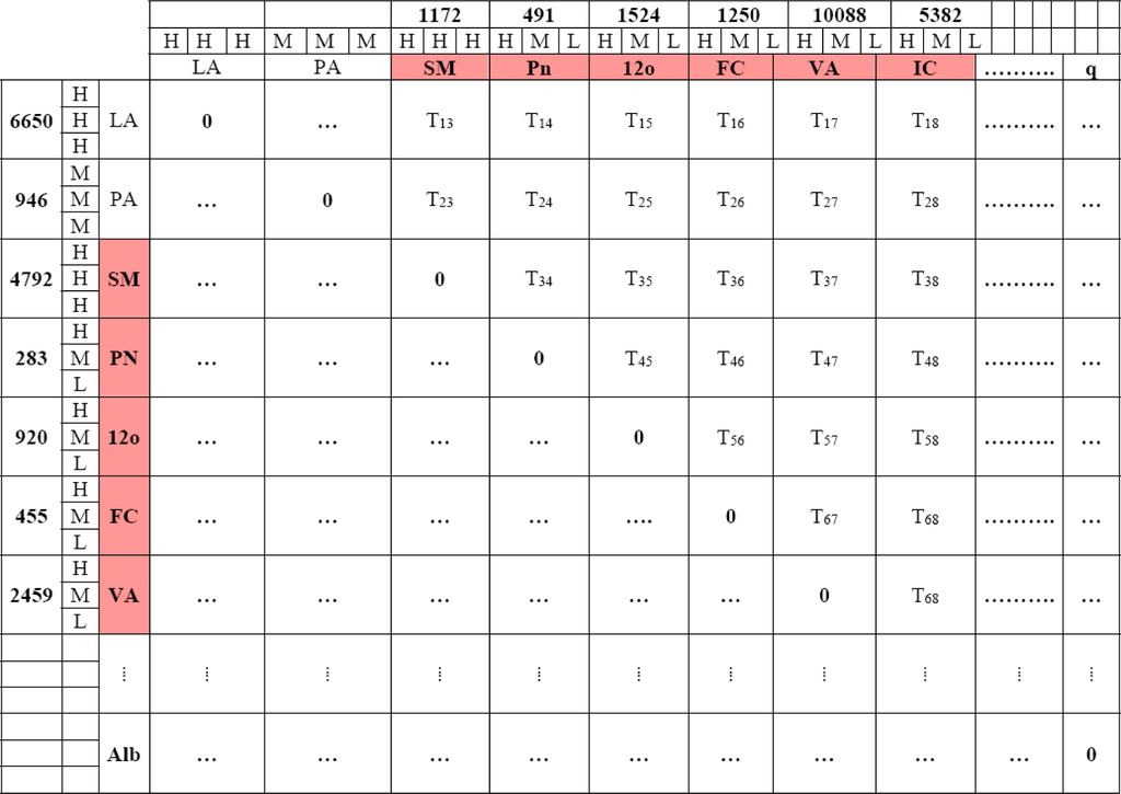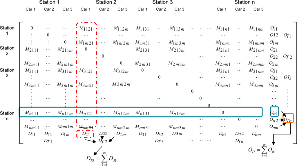 - CDIj, COJi and CMIiJj are chosen based on the experience of an expert or railway planner. The exponents CDIj and COJi are related to the passengers’ preferencea for boarding (alighting) to (from) a specific car in a given station, respectively. The exponent CMIiJj sets the relative level of importance of the flow of passengers between the car i at I station to the car j at J station. If the chosen exponent is zero, the estimation becomes the maximum entropy estimation (i.e., medium demand), while if the exponent is +1 or −1, it corresponds to a car with high or low demand, respectively.