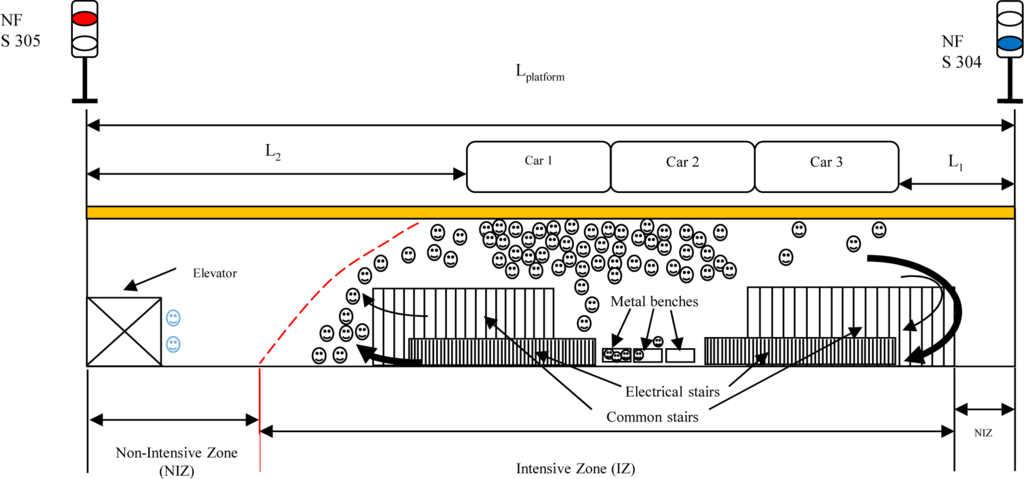 - Many passengers know the location of stairs, elevators and other facilities on the platform of the destination station. As a result, the cars that are closer to these facilities have a greater flow of passengers. People will naturally select the shortest route available to the exits. This is to be expected mainly during the rush hour period. This aspect is similar to the one in the previous point but considering the selected car for arrival.