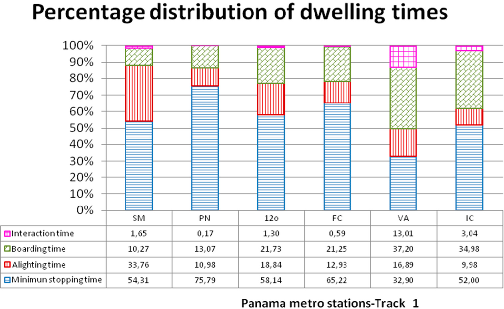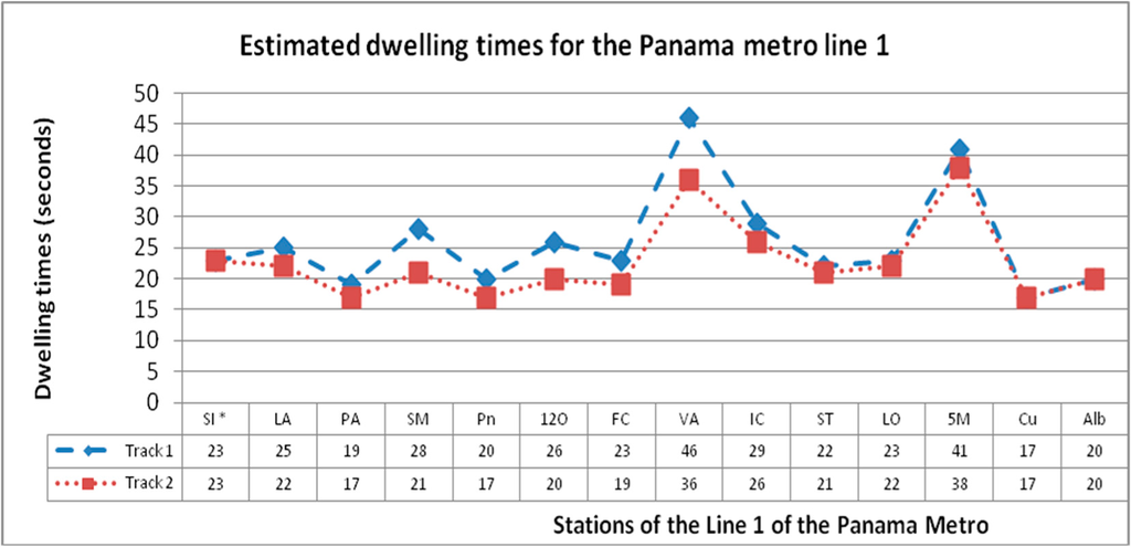 - Estimated dwelling times of the Panama Metro Line 1 for each station and both tracks.