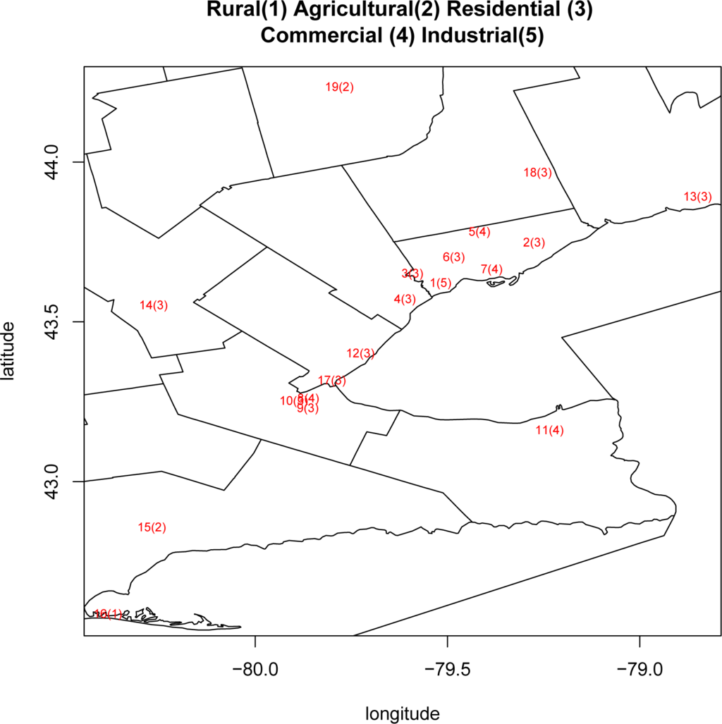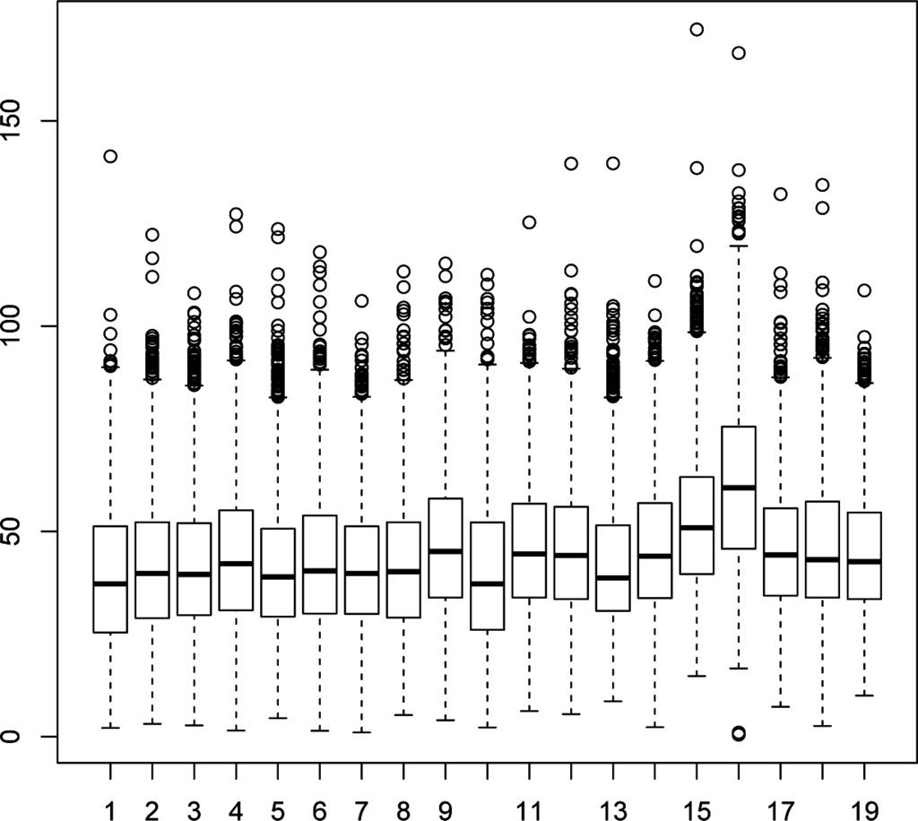 In this section, we use the methodology proposed in the previous section to detect changes in ground-level ozone concentration data collected in the Toronto region of Canada between June and September for the years from 1988 to 2009. There are 19 monitoring stations in this region, and the rate of missing data at each station is below 50%. We primarily focus on the daily time scale in four consecutive summer months from June to September for the years ranging from 1988 to 2009. Thus, we have the original data Xi,t, i = 1,…, 19; t = 1,…, 2684, formed by 2684 (22 years × 122 days) daily maximum eight-hour moving averages of hourly ozone concentration data recorded in micrograms per cubic meter from each of the 19 stations, which are displayed in Figure 1. Figure 2 displays the locations of the 19 stations and their indexes. The numbers of missing data at nine of the stations are under 200, while the numbers of missing data at the other five stations are between 400 and 800. The remaining five stations have a number of missing data close to 1000. Figure 3 presents the box-and-whisker plots of the data collected at each station. It is clear that the data at each station are not normally distributed. Thus, we apply the Box–Cox power transformation (1) to the data {Xi,t} and obtain the transformed data {Zi,t(λ)}, for each λ ∈ {0.3, 0.31, 0.32,⋯, 0.6}. The final value of λ will be decided later.