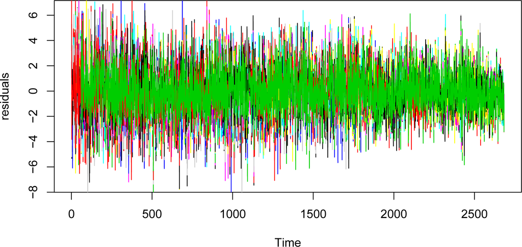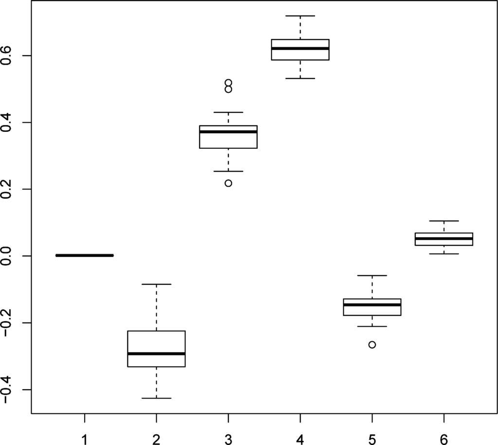 , we compute the Box–Pierce test statistic ([23])for each of the two null hypotheses H0 : ρ(1) = ρ(2) = ρ(3) = ρ(4) = 0 and H0 : ρ(1) = ρ(2) = ⋯ = ρ(7) = 0, where ρ(k) is the autocorrelation at lag k (R code: Box.test). The box-and-whisker plot of the p-values from the Box–Pierce test is displayed in Figure 6, which shows that both null hypotheses cannot be rejected, i.e., the residuals can be considered as uncorrelated at Lags 1 to 7.
