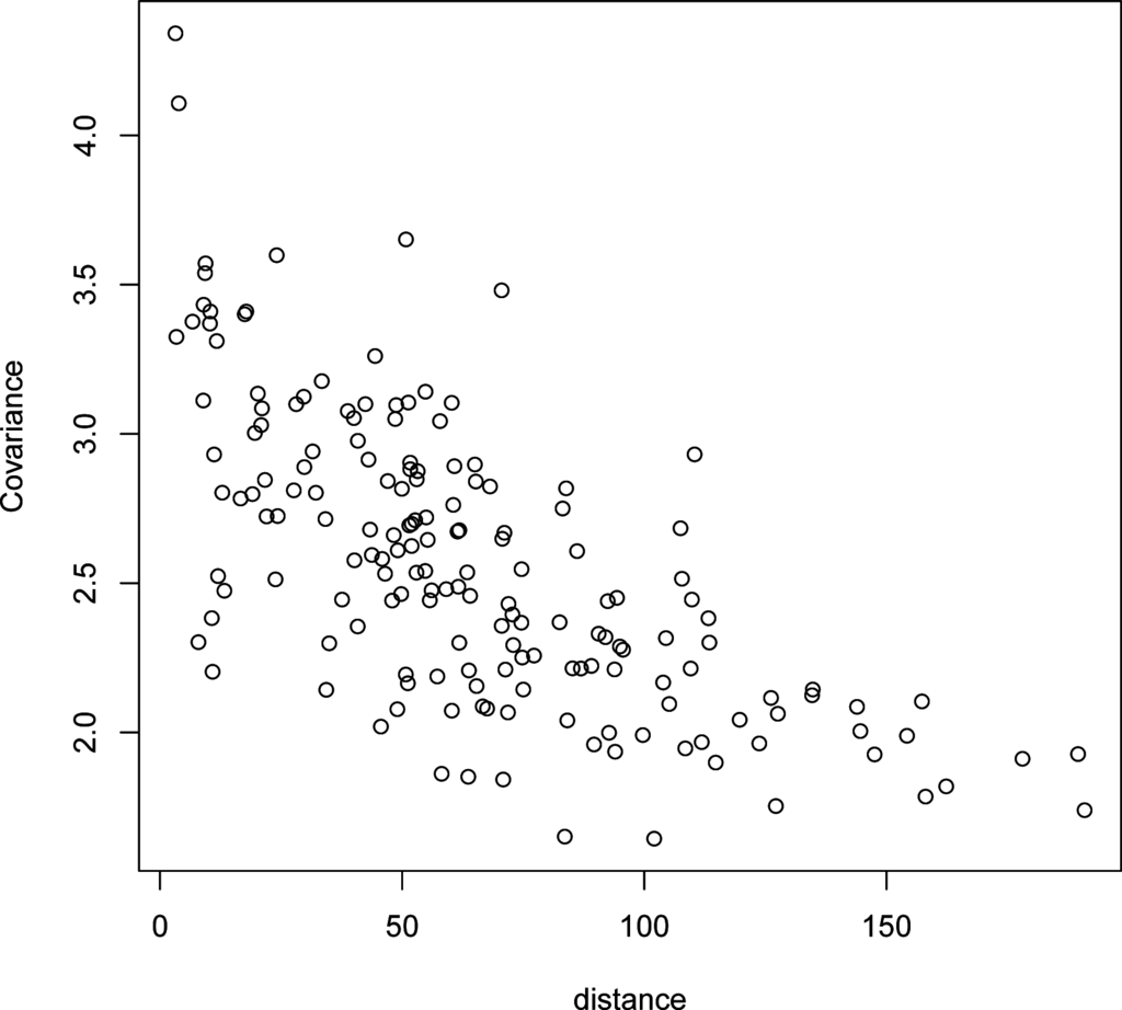 - Step 3. Compute the sample covariance of the residuals resulting from fitting two temporal models to the data from two stations. Find the relationship between the covariance and the distance between the two stations, and then, construct the spatial weights matrix W. For example, if the sample covariance is decreasing as the distance between the corresponding two stations is increasing, we can use the inverse of the distance as the corresponding off-diagonal element in the spatial weight matrix W.Use the matrix W to establish the simultaneous autoregressive (SAR) model at each time. Estimate the parameters of the SAR model by using the residuals obtained by fitting N temporal models to the ozone concentration data.