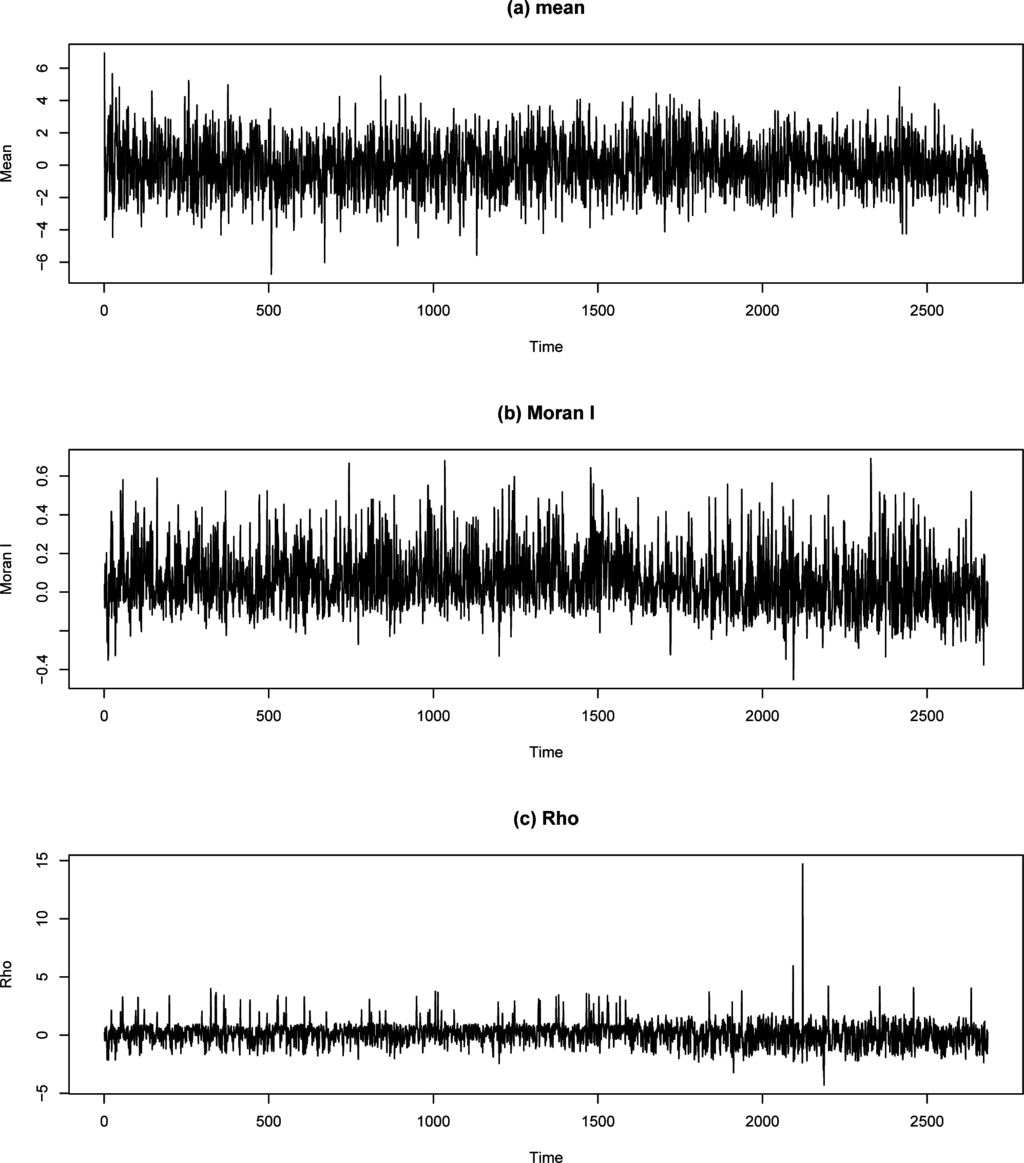 The data have been assumed to be spatially correlated. To confirm this, Moran’s I is used to test the dependence at each time, which is computed by: