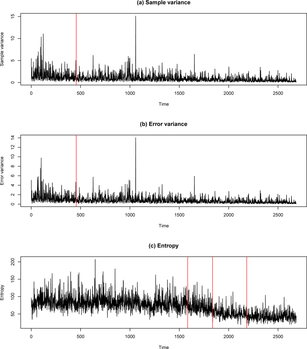 - Step 4. Estimate the entropy ht of the SAR model at each time t and denote it by ĥt. Apply the change-point detection method given in [21] to the entropy time series {ĥt} to detect multiple change-points.