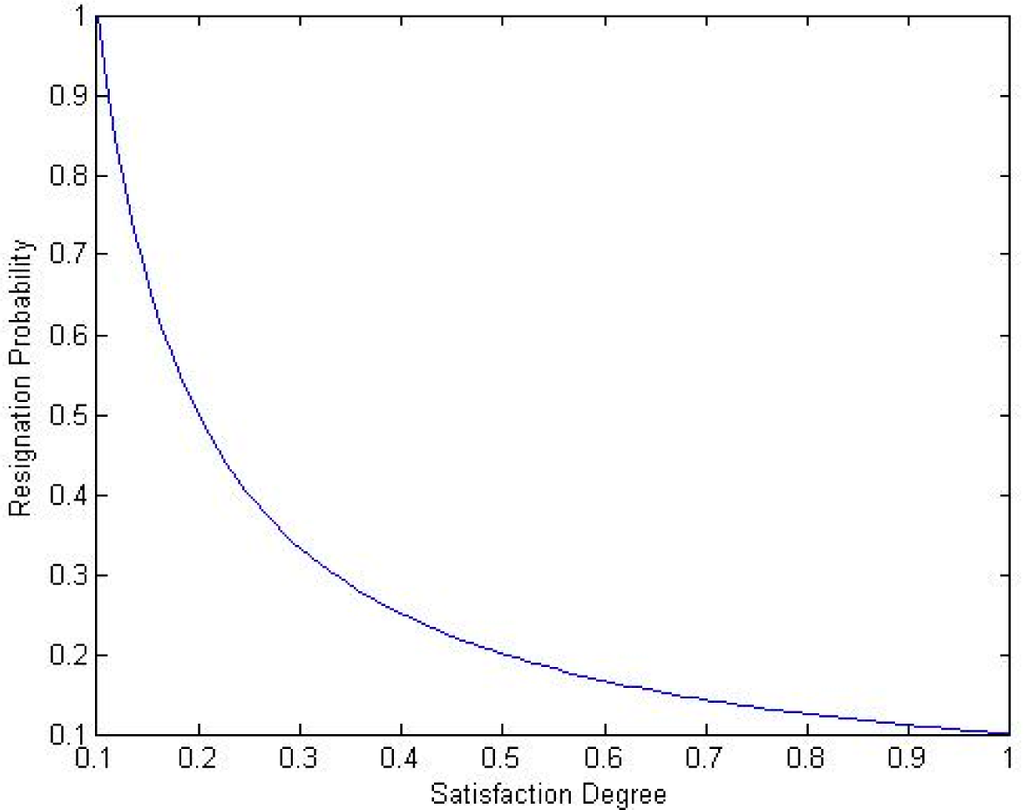 In this section, staff turnover mainly refers to resignation, which occurs because of job dissatisfaction. Turnover probability is inversely proportional to satisfaction, as shown in Figure 1. Higher dissatisfaction results in higher turnover probability, and vice versa.