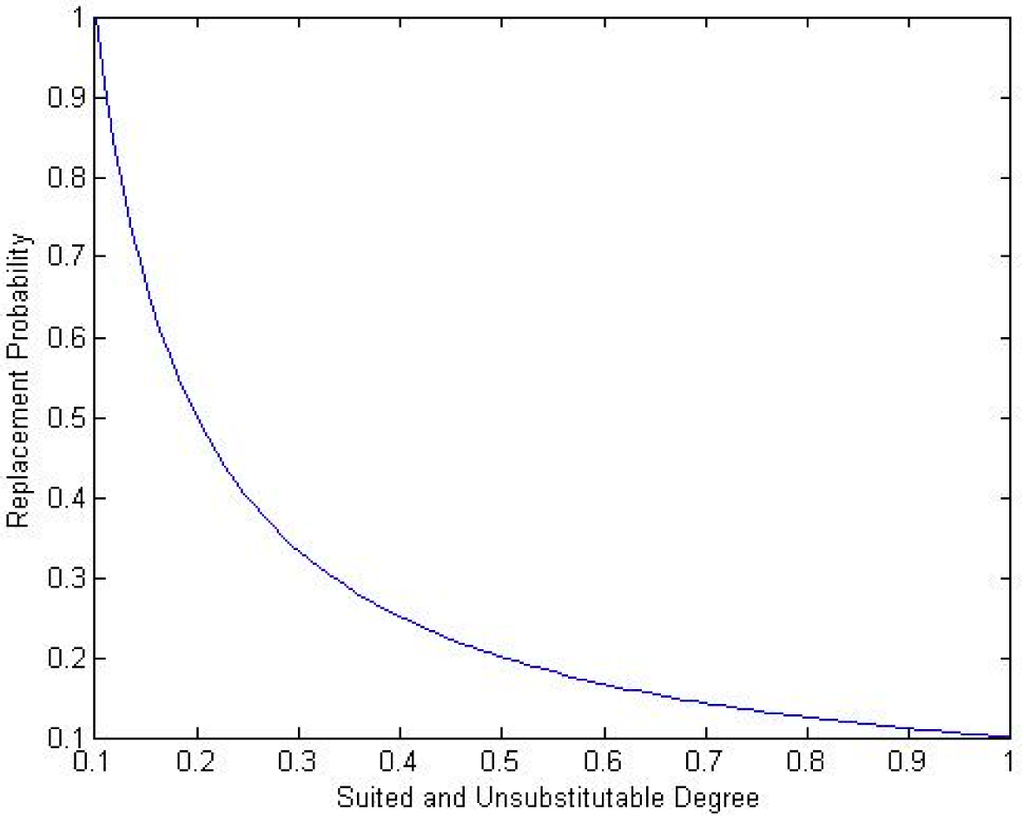 According to the analysis in Section 3.2, replacing staff presents risks, except in cases in which the staff resigned. The replacement probability is negatively correlated with the suited and the unsubstitutable degrees for the job, as shown in Figure 2.