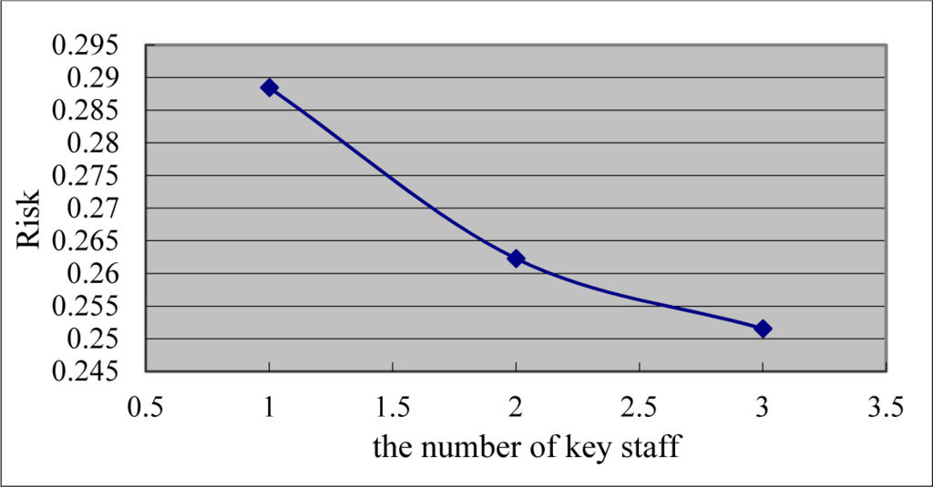 Figure 3 and Table 6 indicate that risk increases as the probability increases, and vice versa. Figure 4 and Table 6 indicate that risk decreases as the risk loss decreases, and vice versa. Figure 5 and Table 6 indicate that if one project depends primarily on a few people, turnover will pose a major risk to the project once resignation or replacement occurs. Staff order degree will decrease by adding a number of key staff, thereby decreasing the risk. On the contrary, if only one key staff exists, the order degree and the risk will be significantly high.