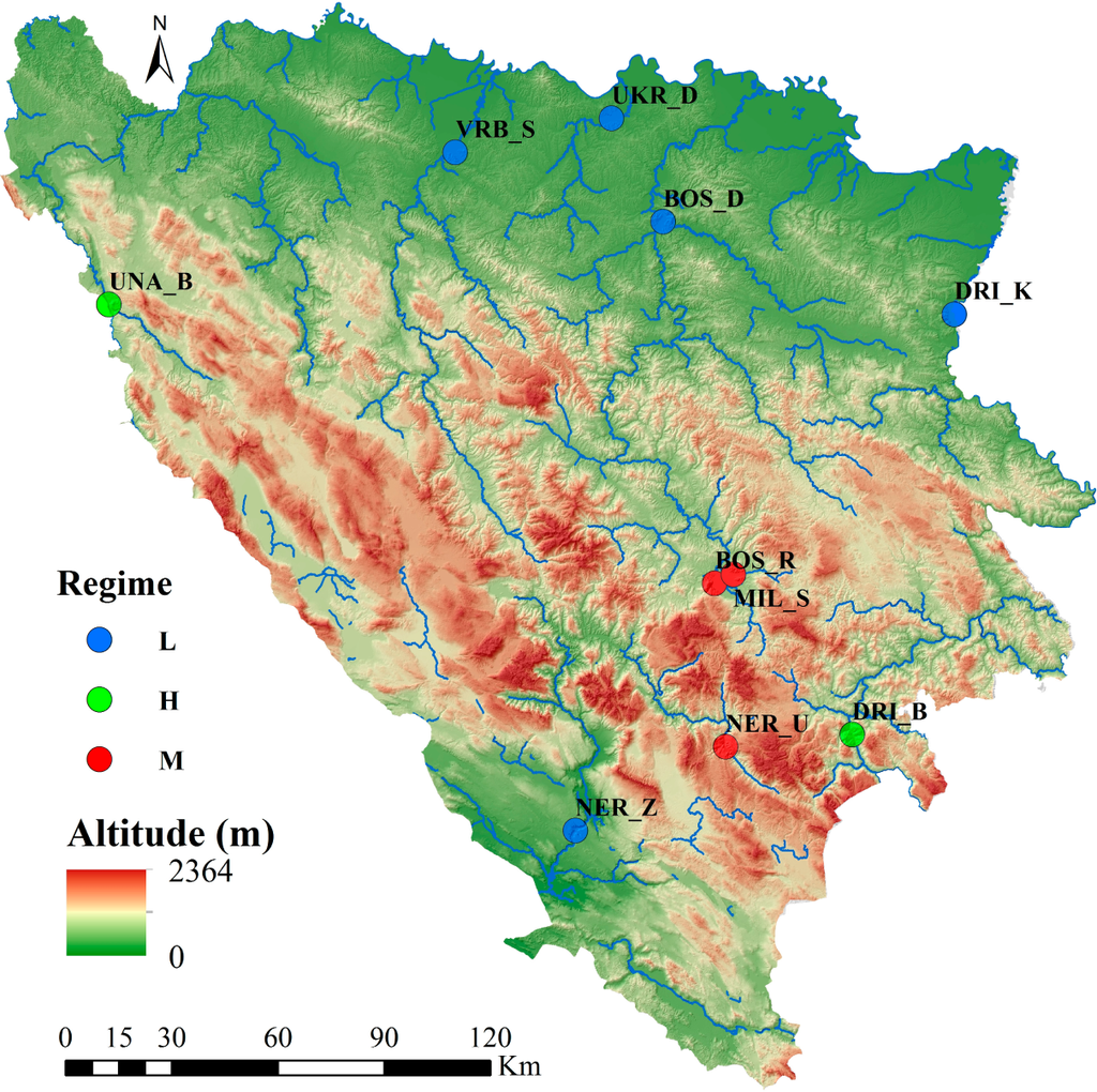 Rivers in Bosnia and Herzegovina used in the study with the corresponding flow rates (FR—mean; FRmax—maximal; FRmin—minimal for the period 1965–1985) and their classification following a classification of typology for mountains and other relief classes by []: lowland (altitude < 200 m)—(L regime), platforms and hills (200 < altitude < 500 m)—(H regime) and mountains (500 < altitude < 6000 m)—(M regime).