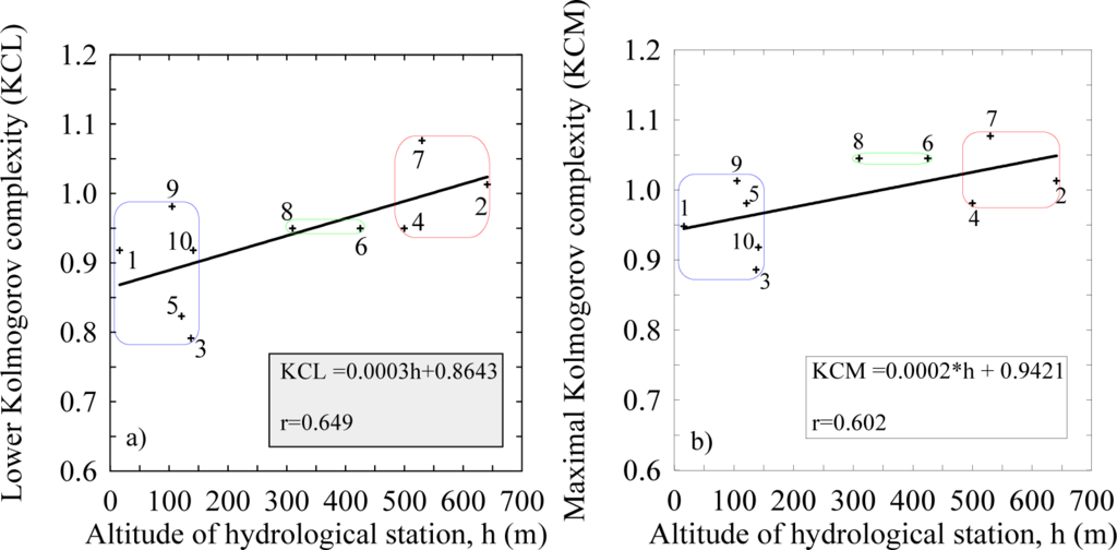 Figure 3 depicts the changes in the KCL and KCM complexities of river flow rate for ten time series of seven rivers in Bosnia and Herzegovina for the period 1965–1986, in dependence on the altitude of hydrological station. There is a positive trend in changes of the KCL and KCM with coefficients of correlation r, which are close to each other 0.649 and 0.602, respectively.