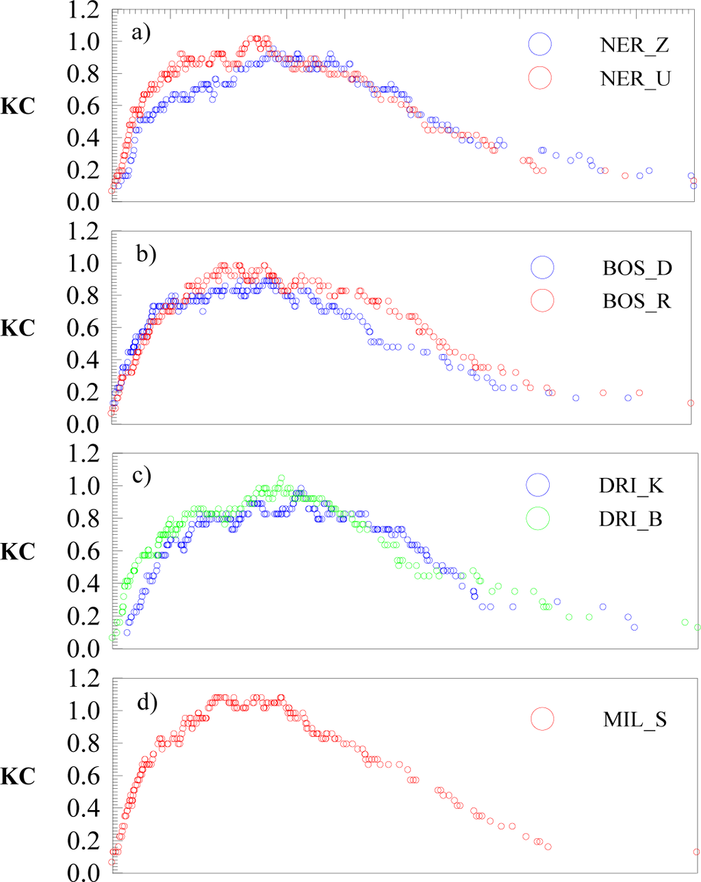 According to Definition 1 in [], the time series {xi}, i = 1, 2, 3, …, N is called normalized one (or time series with normalized amplitude) after performing the transformation xi = (Xi− Xmin)/(Xmax− Xmin), where {Xi } is a time series obtained either by a measuring procedure or as an output from a environmental or other model, while Xmax = max(Xi) and Xmin = min (Xi). From this definition it follows that all elements in time series {xi} lay in the interval [0, 1]. The Kolmogorov complexity spectrum of time series {xi} we call the sequence {ci}, i = 1, 2, 3,…, N obtained by the LZA algorithm which is applied N times on time series, where thresholds {xt,i} are all elements in {xi}. Namely, the original time series samples are converted into a set of 0–1 sequences {S(k) i}, i = 1, 2, 3, …, N, k = 1, 2, 3, …, N, defined by comparison with a threshold {xt,k}: