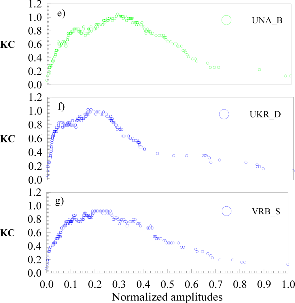Over the last decade many results have been obtained about the chaotic nature of river flow using different techniques like complexity measures [,], detrended cross-correlation analysis, formalism of fractal analysis etc., to provide deeper insight regarding this issue [,,]. We have analyzed the monthly river flow time series of the seven rivers in Bosnia and Herzegovina for the period 1965–1986, with N = 252 data points. The curves describing the Kolmogorov complexity spectra for the time series of flow rate of seven rivers and ten stations are depicted in Figure 4. From this figure it is seen that flow dynamics of rivers are different in sense of the position and value of the maximum of the Kolmogorov complexity spectrum highest value (KCM). A simple inspection of this figure indicates the following facts for the same river: (i) when the river is in the M regime, i.e., with a pronounced presence of stochastic components in the river flow, then the KCM is greater in comparison with its KCM in the L regime; (ii) the position of the maximum in the M regime is shifted towards the smaller normalized amplitudes (Figures 4a,b); (iii) when the river is in the H regime, i.e., when presence of stochastic components in the river flow is less pronounced than in M regime, then the KCM is slightly greater in comparison with its KCM in the L regime, while the position of the maximum in the H regime is still shifted towards the smaller values in the spectrum (Figure 4c). Note, that these conclusions could not be obtained if we compare the regimes of different rivers. From other Figures 4d–g it is seen that the maximum of the Kolmogorov complexity spectrum of the river flow time series is more shifted to the smaller values for the regimes where river flow has the higher randomness.