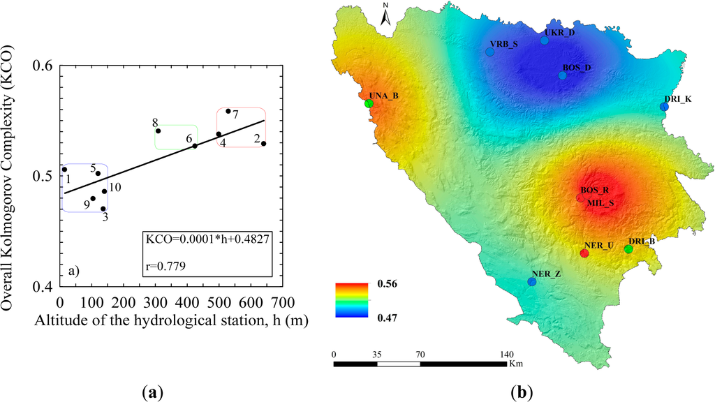The KCO information measure: Dependence on altitude (a) and spatial distribution (b) of the monthly flow rate for ten time series of seven rivers in Bosnia and Herzegovina for the period 1965–1986.