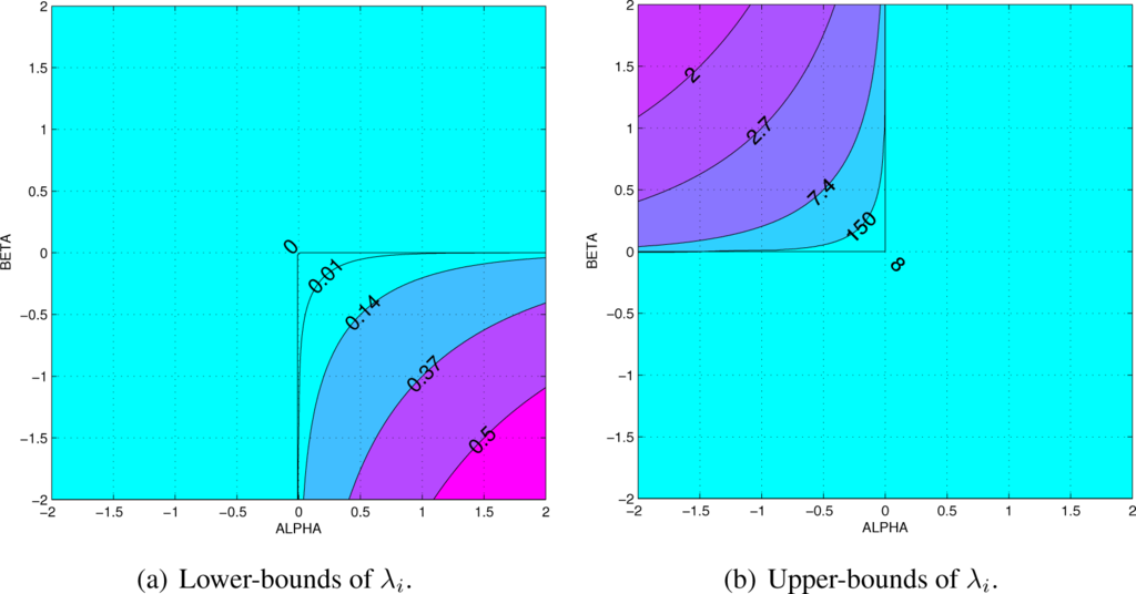 In the limit, when α → 0 or β → 0, the bounds disappear. A visual presentation of these bounds for different values of α and β is shown in Figure 1.