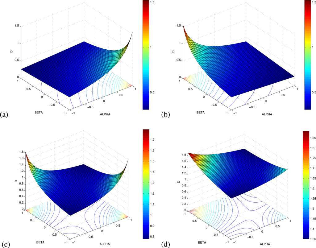 Two-dimensional plots of the AB log-det divergence for different eigenvalues: (a) λ = 0.4, (b) λ = 2.5, (c) λ1 = 0.4, λ2 = 2.5, (d) 10 eigenvalues uniformly randomly distributed in the range [0.5, 2].