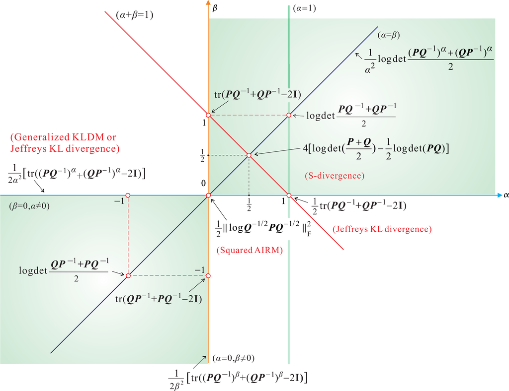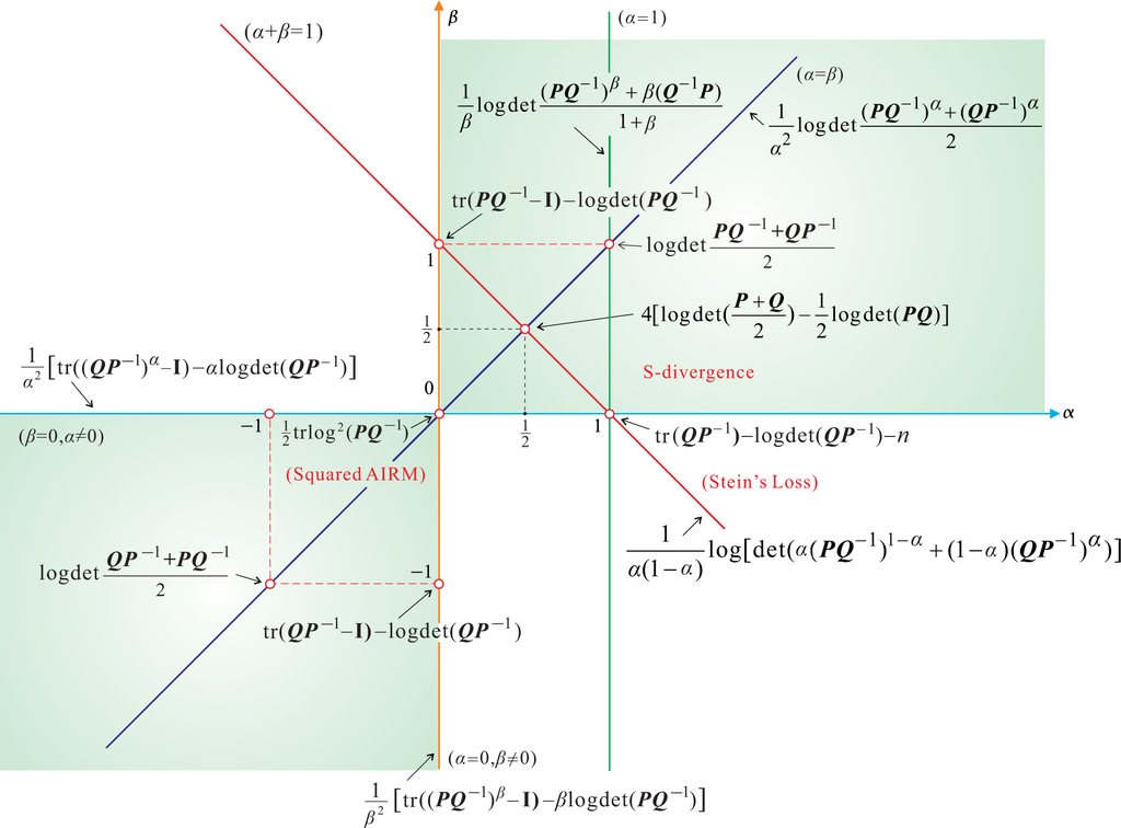 We now illustrate how a suitable choice of the (α, β) parameters simplify the AB log-det divergence into other known divergences such as the Alpha- and Beta-log-det divergences [5,11,18,23] (see Figure 3 and Table 1).