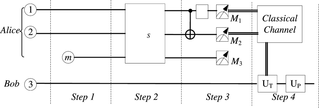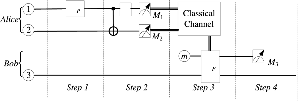 - Step 3: Subsequently, the auxiliary particle m is measured and particles 1 and 2 are performed in the form of the Bell-state measurements. Then, Alice transmits measurement results information to Bob in the manner of classical channel.