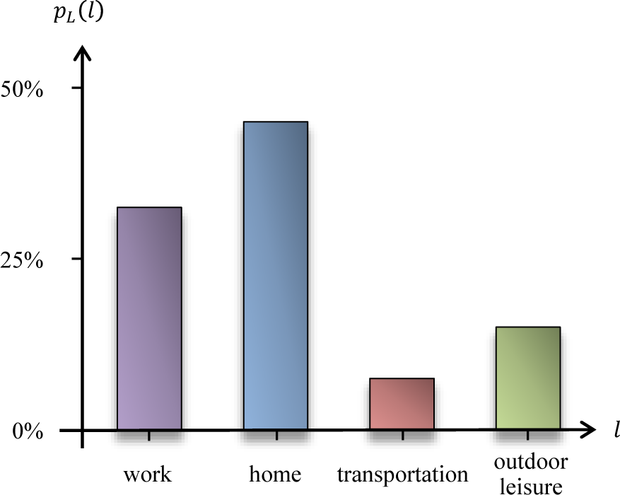 - Definition (location profile): Let L be a random variable (r.v.) representing the location of a given user, from an alphabet of predefined location categories . The time of the location referred to is chosen uniformly at random. We model the location profile of said user as the probability distribution of L; precisely, the probability mass function (PMF) pL of the discrete r.v. L. Thus, pL(l) is the probability that the user is at location at any given time. In other words, pL(l) represents the relative frequency with which the user visits this location.