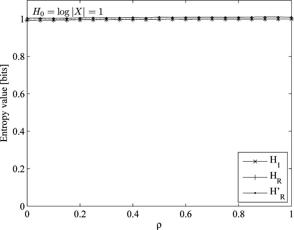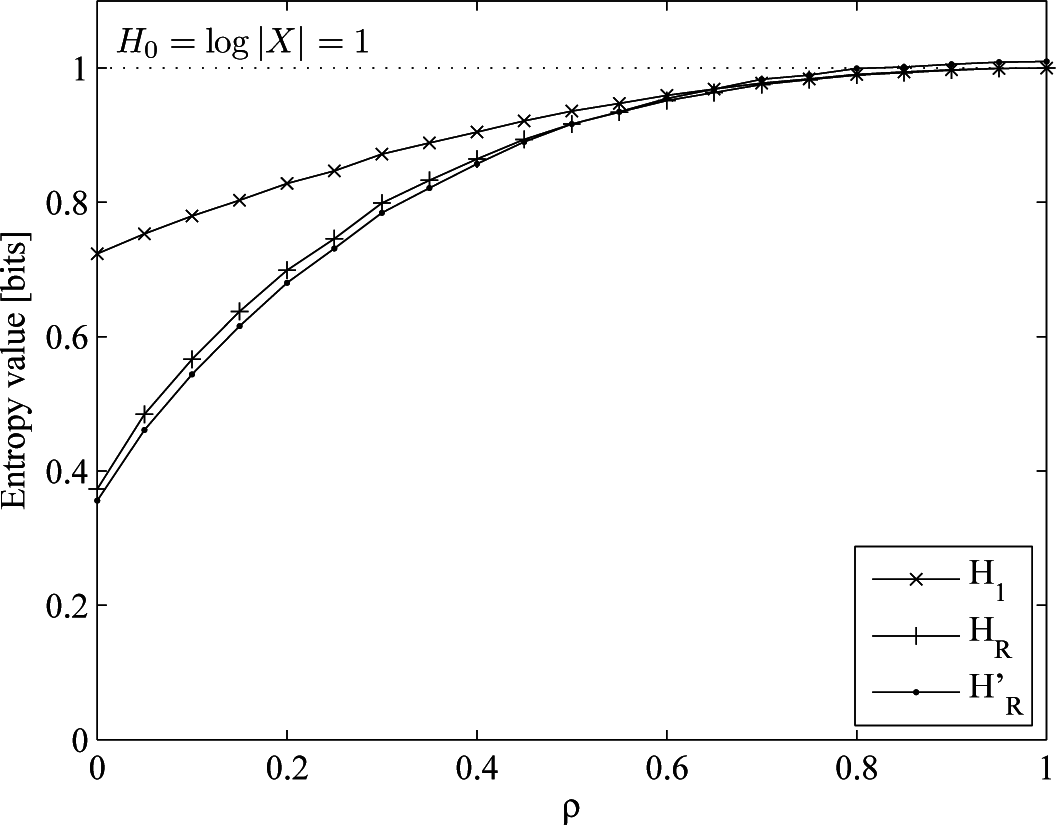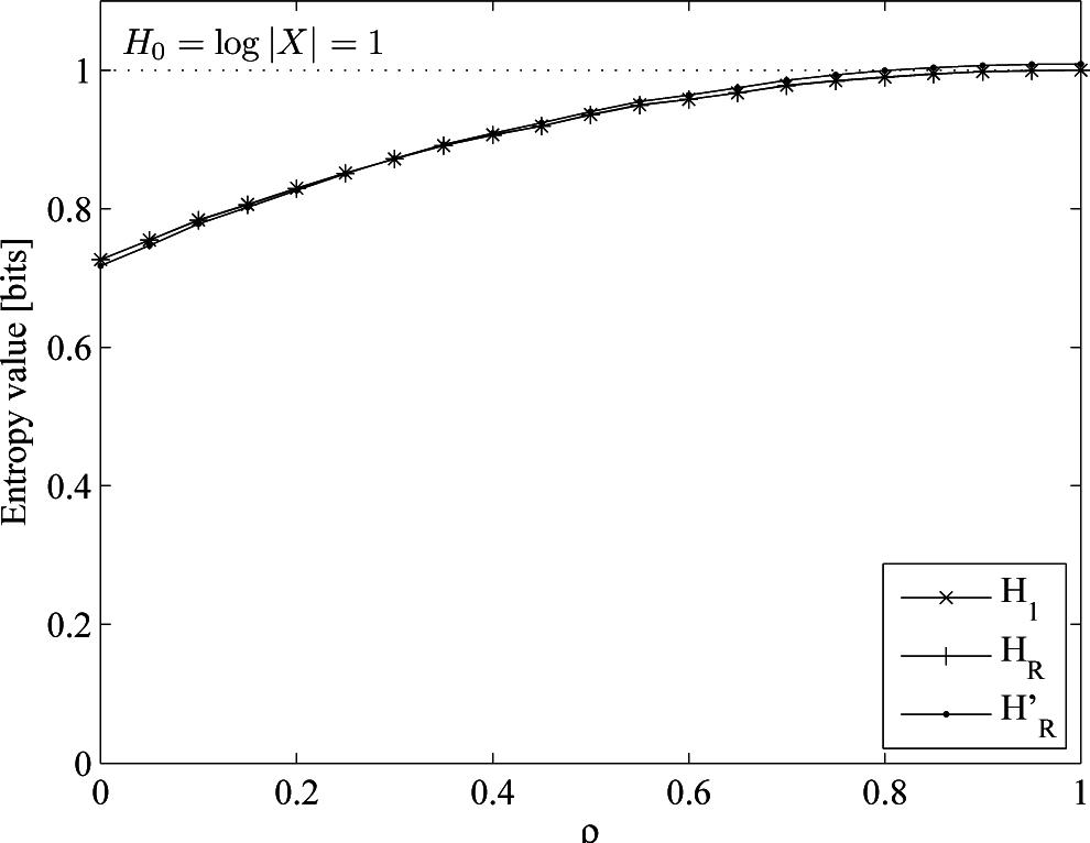 - A Markov process with p(1|0) = 0.2, p(0|1) = 0.05, p(1) = 0.8, H0 = 1, H1 = 0.772, HR = 0.374. In this case, we increase the memory of the process, keeping the cardinality and probability distribution with respect to the second case.