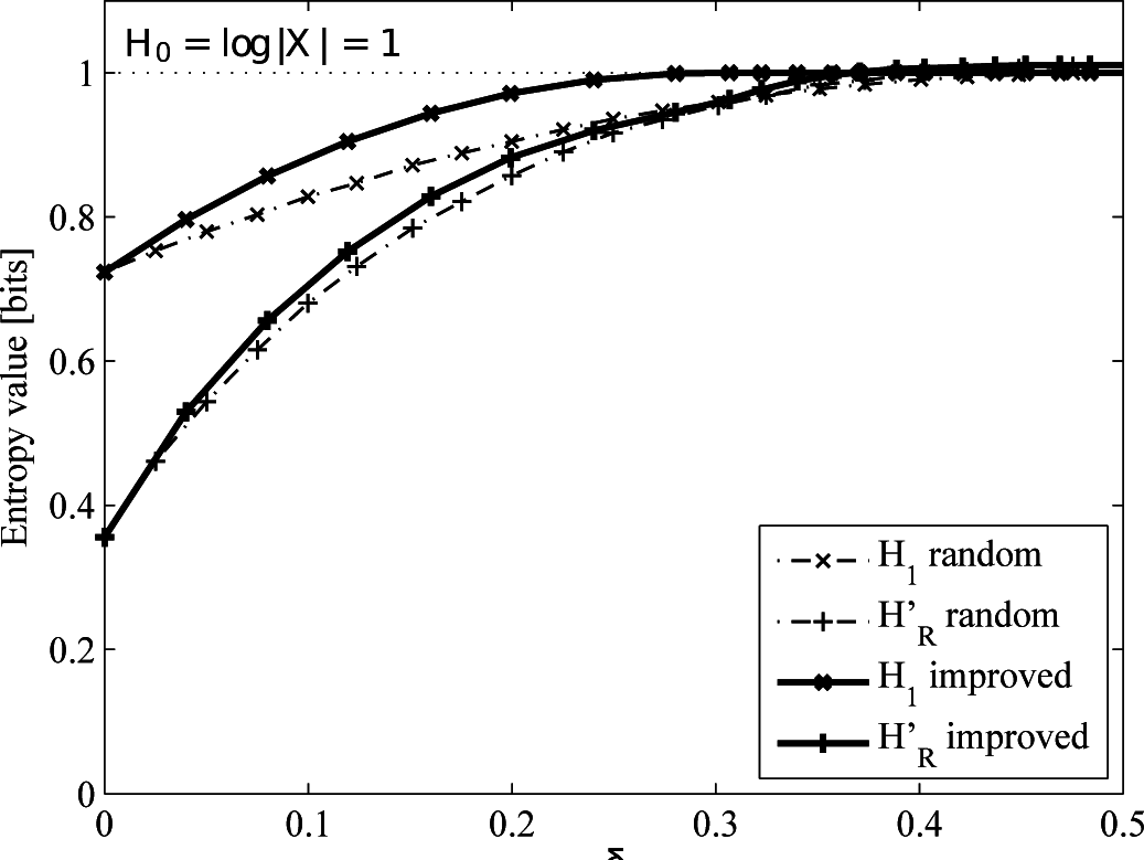 - An i.i.d. (not uniform) process, drawn from an order-one Markov process with p(1|0) = 0.8, p(0|1) = 0.2, p(1) = 0.8, H0 = 1, H1 = HR = 0.772. Here, we keep the process memoryless and change the probability distribution, such that there is a bias towards one of the two symbols of the alphabet.