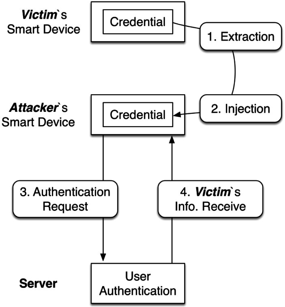 The major weakness in credential management for existing apps is that the credential is simply stored within the smart device without any security measures. To block credential cloning attacks, the credential should be stored separately and managed on an external device. In this way, an attacker would be unable to gain access to the credential using only the victim’s smart device. As a result, without the ID and password or credential, the attacker cannot login to the service provider, and cannot gain access to any of the victim’s information. This solution has the drawback of requiring a separate medium. However, as a countermeasure for recent mobile app security vulnerabilities, security solutions that utilize a variety of external devices (including wearable computing devices such as the smart watch) are being actively implemented. Thus, it is predicted that, gradually, the resistance to security methods that require a separate device to be carried will decrease.