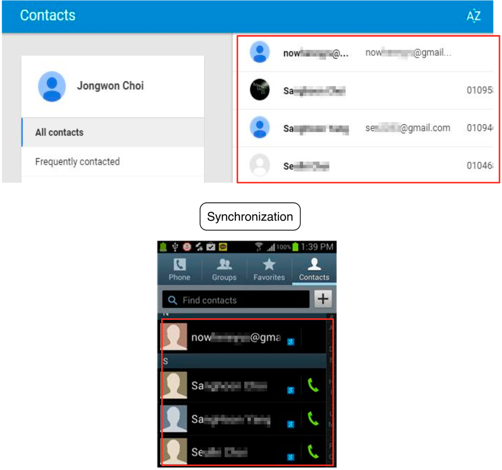 Figure 10 illustrates the leakage of contacts stored on the Google server. This may occur when an attacker synchronizes their own smart device using a victim’s Google Account credential to automatically log-in. Because Google Account not only syncs contacts, but also user information such as e-mail, calendar, app data, web history, and so on, even personal information such as the victim’s name, gender, age, and occupation is also leaked.