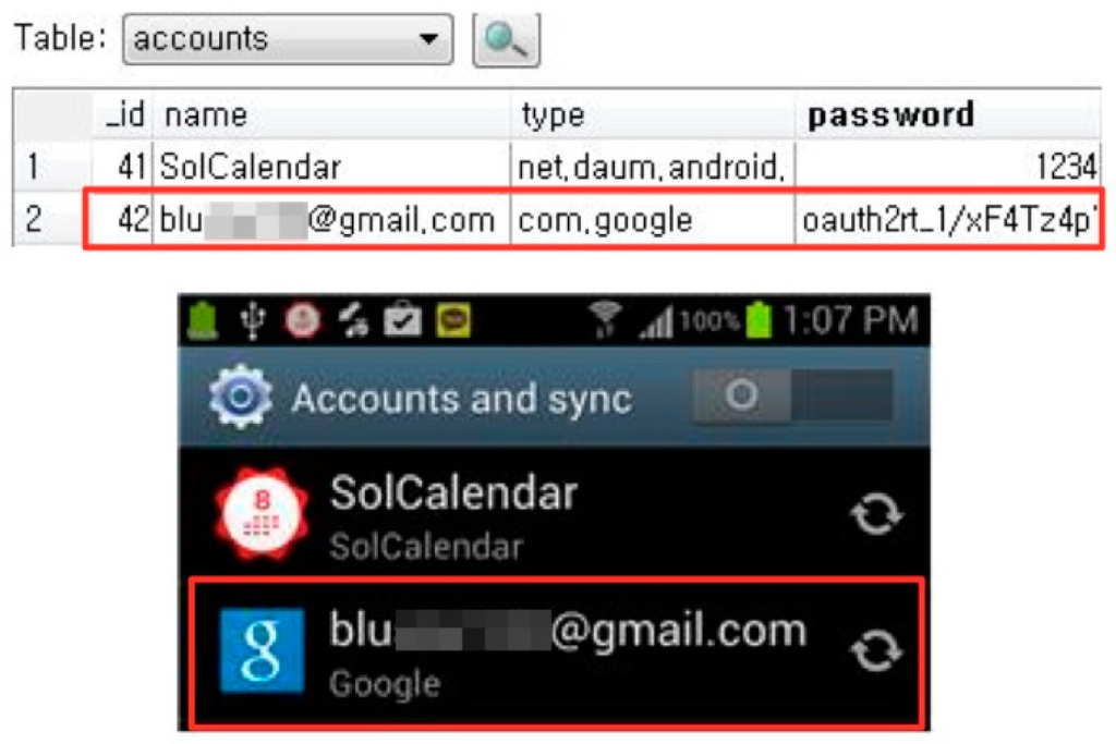 The Android platform uses Linux’s user-based protection feature, called sandbox [12], to differentiate applications, with each app assigned a UID (User Identifier). To support this feature, sandbox should be implemented in the kernel level. Thus, user-privileged apps cannot exchange data with other apps. In other words, because the credential is a kind of data, it is stored where it cannot be accessed by other apps. Thus, we apply a well-known rooting technique to enable the attacker to access the victim’s credentials on the target device.