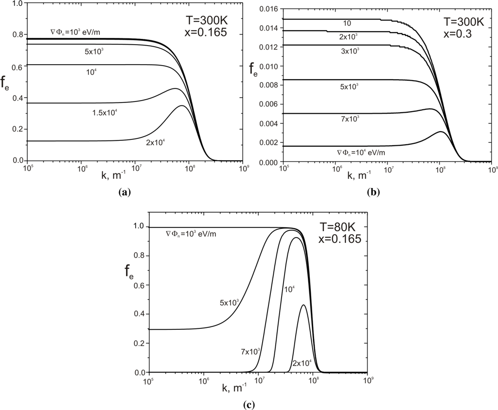 We discuss here the calculation method consisting of calculating the electron and hole distribution function, as well as presenting the exemplary results of the calculations for electrons (relation Equation (40)). The calculations will involve ternary semiconductor compounds of mercury cadmium telluride (MCT) (CdxHg1–xTe) with two chosen values of x, a mole fraction of CdTe (x = 0.165 and x = 0.3), a concentration of donors ND = 1015 cm−3 and acceptors Na = 1013 cm−3. Data on the physical parameters of the material can be found, for example, in the book edited by Capper [26]. While conducting the numerical modeling of devices, we are not able to calculate non-equilibrium distribution functions at the heterostructure selected points directly using only relation Equations (40) and (43). The calculations must be conducted by iterative methods, because Equations (40) and (43) are highly non-linear. In turn, these values are dependent on external forces maintaining a steady state and on a distribution function. First, our calculations begin for a thermal equilibrium state by solving the Poisson equation with iterative methods for given spatial distributions of a molar composition and doping. This allows the determination of the spatial distribution of electric potential, as well as the electron, holes and ionized dopant concentrations. In order to determine these concentrations, the Fermi–Dirac functions applicable to the thermal equilibrium state are used. The accurate description of this method is in the paper of Jóźwikowska [27].