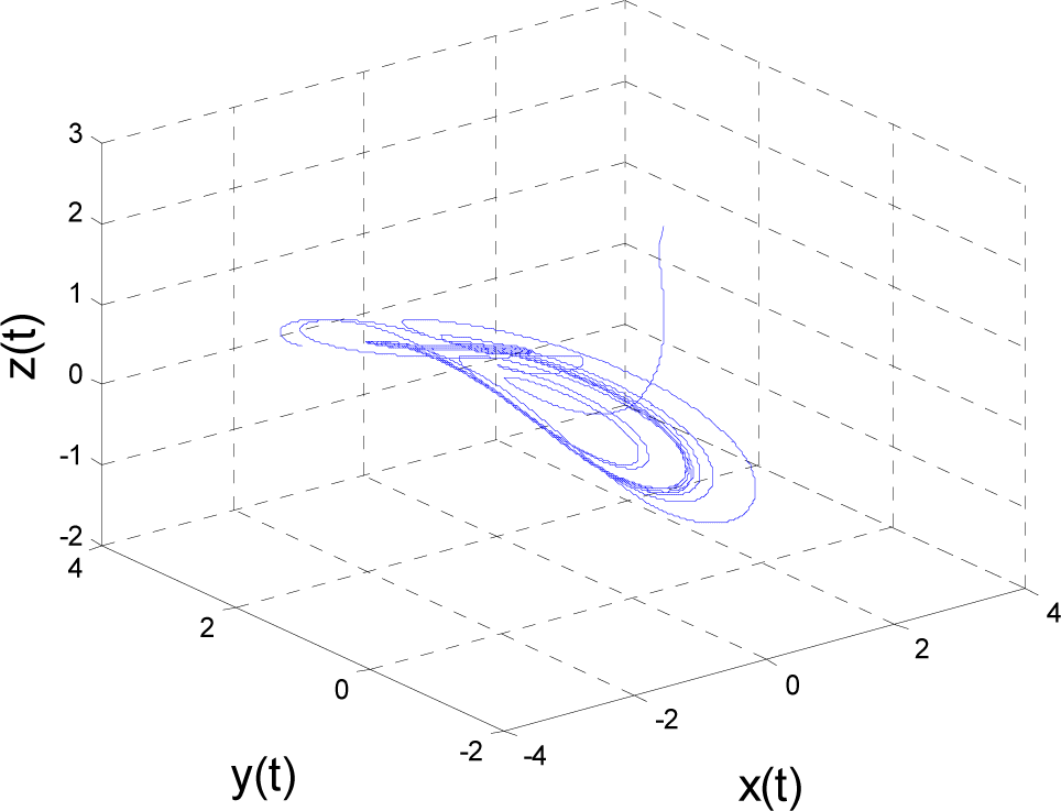 With the above fractional orders and initial conditions, systems (35) and (36) possesses a chaotic behavior, as shown in Figures 1 and 2. To observe the control effect of controller, the state trajectories of Equation (38) without control are firstly given in Figure 3. When the controller is activated, we can obtain the desired time responses of system (38), shown in Figure 4. It is not difficult to see that all state trajectories converge to zero asymptotically, which implies that a class of uncertain fractional-order chaotic systems (38) with sector nonlinear input can be stabilized. Reference [18] has the same synchronization time as this paper, but in this paper there is less codes by contrast. Figures 1 and 2 show chaotic attractor images of the driving system and response system, respectively.