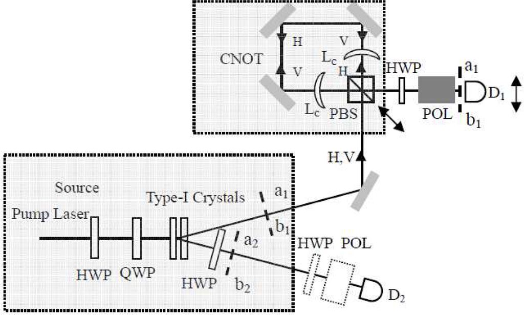 In 2006, Walborn et al. first experimentally realized the direct concurrence measurement of an arbitrary pure momentum photon stateas α|01⟩ab + β|10⟩ab [48,49]. Here, a and b represent two spatial modes, while “1” and “0” represent one and zero photons, respectively. The measurement process relies on the hyperentanglement. The experimental setup of the protocol is shown in Figure 1. In the protocol, two copies of a bipartite quantum state are created using a photon pair, which are generated in the spontaneous parametric down-conversion source. The polarization degree of freedom is stored in one copy of the quantum state, and the momentum degree of freedom is stored in the other copy. Owing to momentum conservation, the momentum states can be generated with neutral filters, phase plates and beam splitters, which combine different momentum modes [58–60]. Meanwhile, an arbitrary pure polarization state can be prepared by pumping two perpendicular nonlinear crystals with the additional help of the half and quarter wave plates placed in the path of both of the pump beams [61].