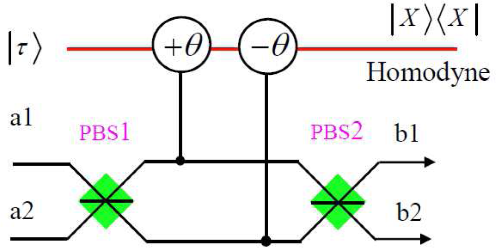 In this way, one can distinguish the odd parity states |HV⟩ and |VH⟩ from the even parity states |HH⟩ and |VV⟩ according to the different phase shifts of the coherent state.