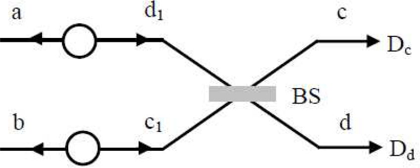 The parties make the photons in c1 and d1 modes pass through the 50:50 beam splitter (BS). Then, the whole four-photon system can evolve to: