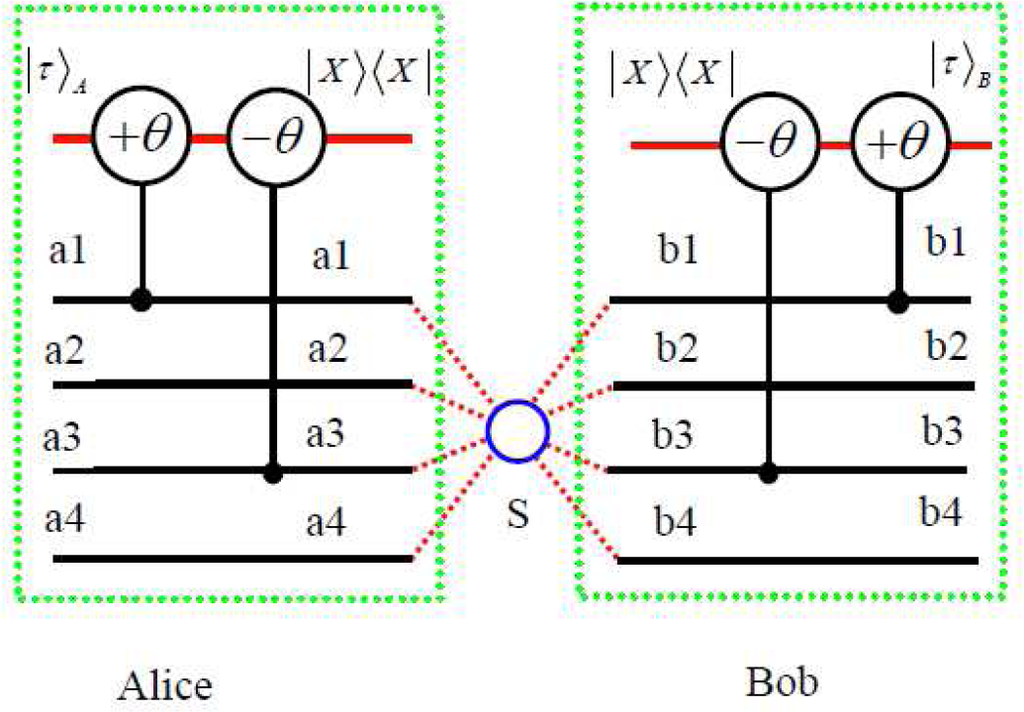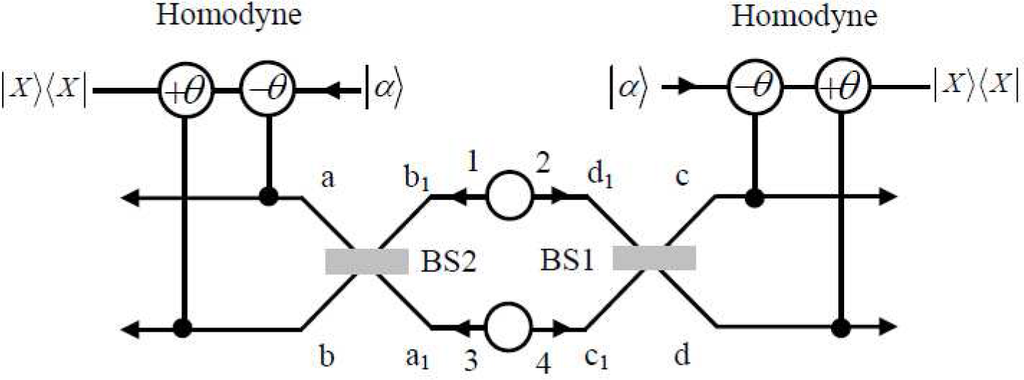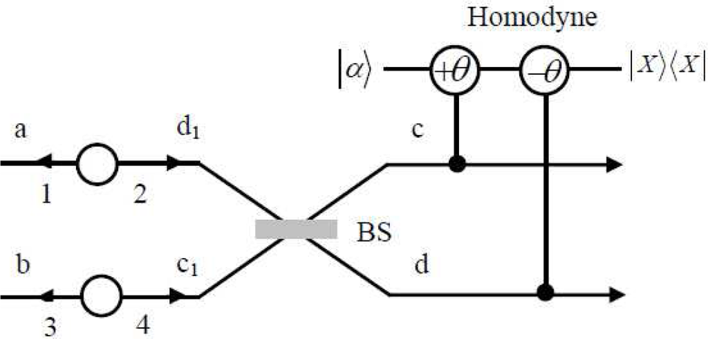 As shown in Figure 3, in the second protocol, the parties make the output photon in c and d modes pass through the cross-Kerr nonlinearities, which will make the coherent state |α⟩ pick up the phase shift of θ and −θ, respectively. After the cross-Kerr nonlinearities, the four-photon state in Equation (17) will evolve to: