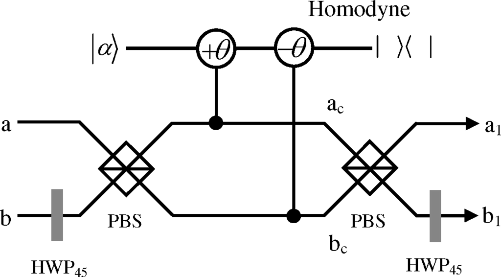 In the same year, the group of Cao put forward another protocol for directly measuring the concurrence of arbitrary two-photon polarization-entangled pure state based on the parity-check measurement (PCM) [51]. The structure of the PCM gate is shown in Figure 5. This PCM gate also resorts to the cross-Kerr nonlinear interaction and can distinguish the superposition and the mixtures of the states |HV⟩ and |VH⟩ from |HH⟩ and |VV⟩. Suppose the parties prepare two single photon states in the spatial Modes a and b as: