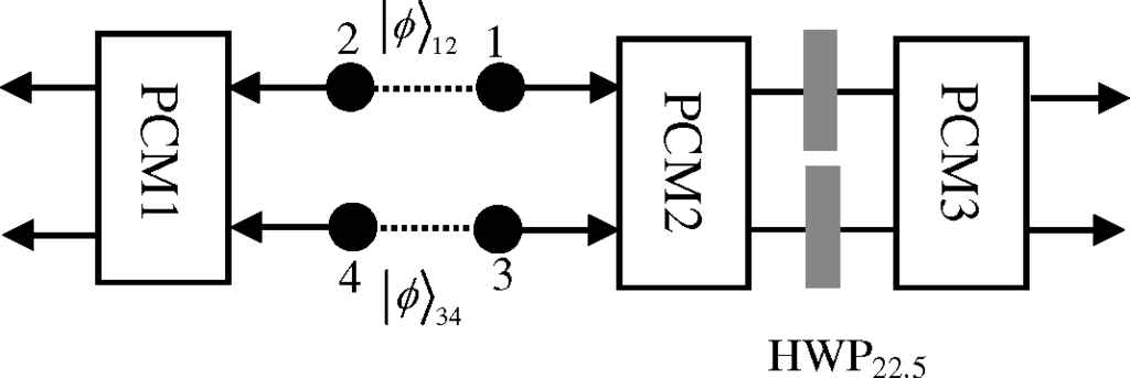 The schematic principle of the protocol is shown in Figure 6. In the protocol, it requires two copies of arbitrary two-photon polarization-entangled states, say |ϕ12⟩ and |ϕ34⟩ with the form of: