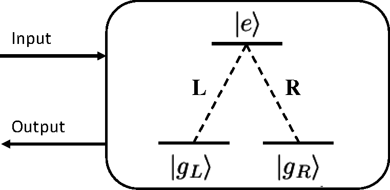 enters the cavity and reacts with the three-level atom, where |L⟩ and |R⟩ represent the left-circular polarization and right-circular polarization of the input photon, respectively. When the atom absorbs or emits a |L⟩ (|R⟩) polarized photon, it will cause the transitions |gL⟩ ↔ |e⟩ (|gR⟩ ↔ |e⟩).