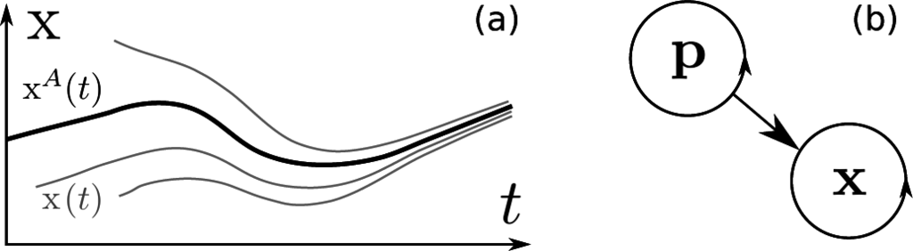 where p ∈ Rn, x ∈ Rm, f : Rn → Rn, g : Rm × Rn → Rm, in which n and m can be any positive integers. Importantly, the solution x(t, t0, x0) of Equation (1) depends on the actual time t as well as on the initial conditions (t0, x0), whereas the solution p(t − t0, p0) depends only on initial condition p0 and on the time of evolution t − t0. The subsystem x is nonautonomous in the sense that it can be described by an equation which depends on time explicitly, e.g.,