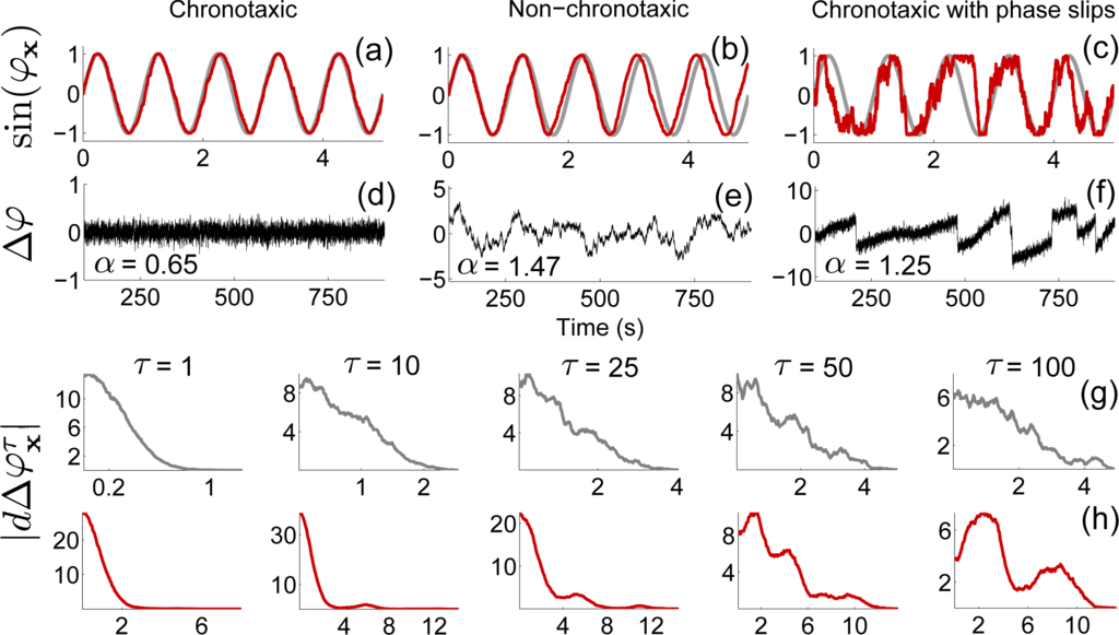 (a)–(c) 5 s time series of sin(φx) (red line) in 3 cases: chronotaxic, non-chronotaxic, and chronotaxic with phase slips, from Equation (21). The grey line shows φp (chronotaxic), and ωxt (non-chronotaxic). (d)–(f) Δφx for the whole time series, detrended with a moving average of 200 s. In all cases ωx,p = 2π, h = 0.001, L = 1000 s and σ = 0.3. ε = 5 and 0 in the chronotaxic and non-chronotaxic cases, respectively. detrended fluctuation analysis (DFA) exponents, α, are shown. The DFA exponent of (f) incorrectly suggests the system is non-chronotaxic. To distinguish between a non-chronotaxic system and a chronotaxic system with phase slips, the delayed distributions were calculated (see Section 3.5) in the non-chronotaxic (g) and chronotaxic (h) case.