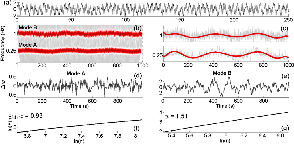 In order to address this question, two unidirectionally coupled phase oscillators (Equation (21)) were simulated for 1000 cycles with frequencies 1 and 0.1 Hz, with h = 0.01 and σ = 0.07. With coupling ε = 2, the system is chronotaxic. The important parameters to consider in DFA are nmin and nmax, the lower and upper values for the range of the first order polynomial fits performed in order to calculate