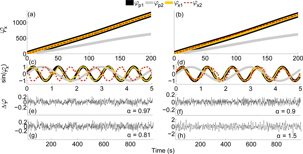 In order to calculate α, the time series Δφx is integrated in time and divided into sections of length n. For each section the local trend is removed by subtracting a fitted polynomial—usually a first order linear fit [6,33]. The root mean square fluctuation for the scale equal to n is then given by