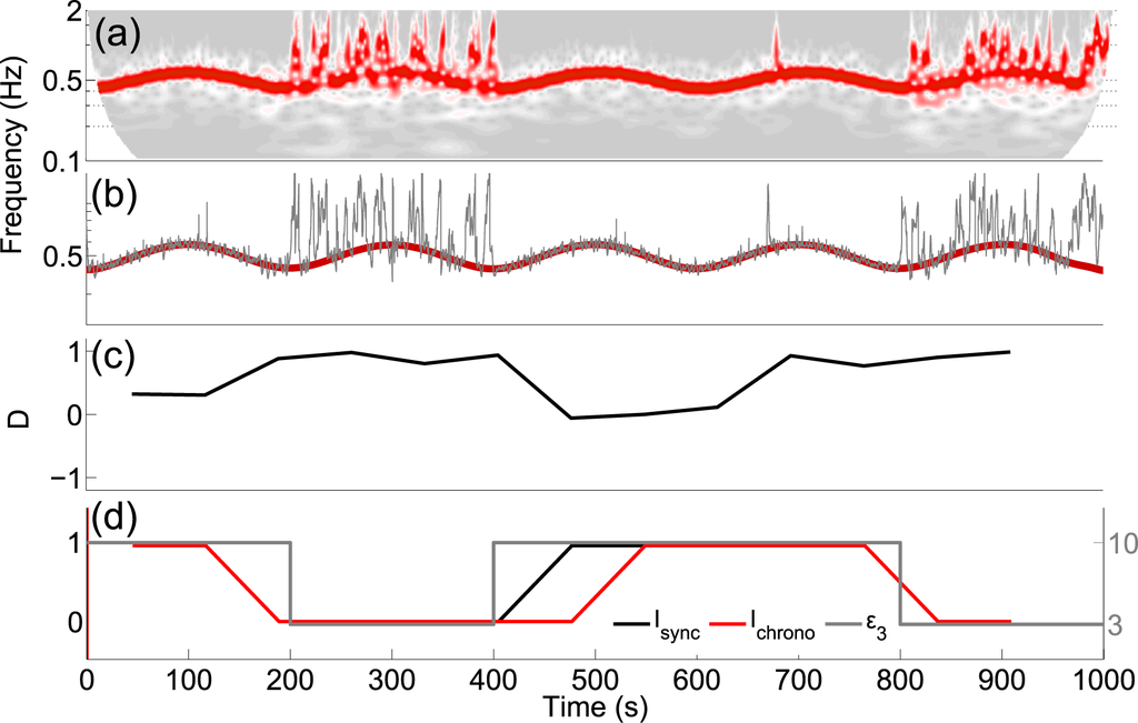 Many signal analysis methods assume stationarity of the frequency distribution of the data, but in nonautonomous systems this assumption is not valid. Single variable time series, particularly those from living systems, must be treated as arising from nonautonomous dynamical systems, due to time-dependent influences of variables other than the one under study. Approaches based on windowing have been applied in order to attempt to treat time variability in data, but these potentially lose crucial information. For example, in phase space reconstruction the window may not be of a sufficient size to capture the whole of the attractor, or its variations in time. Application of the Fourier transform to nonstationary data will result in a blurred or misleading power spectra, severely limiting its usefulness. The windowing approach has been applied here with some success, in the form of the Short Time Fourier transform (STFT), but the use of windowing leads to limitations; the better the time resolution, the worse the frequency resolution (known as the Gabor limit [16]). In addition, the fixed time–frequency relationship at all scales in a windowed Fourier transform severely limits its usefulness for the analysis of low frequency oscillations. This problem can be addressed by using the continuous wavelet transform (CWT), which provides a logarithmic frequency scale (see Section 3.3). The CWT is based on wavelets rather than the sines and cosines used in Fourier based methods. The simultaneous observation of the time and frequency domains is extremely useful in the visualization of dynamical systems and their time evolution. As a result, development of wavelet-based methods specifically for the treatment of time-dependent dynamics is now a very active field of research [15], including wavelet phase coherence [17], the synchrosqueezed transform [18,19] and wavelet bispectrum.