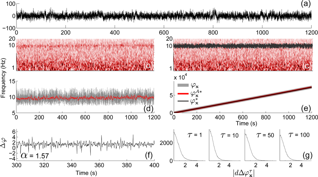 In order to demonstrate the method and search for evidence of chronotaxicity in the phase dynamics of brain waves we applied phase fluctuation analysis to a real EEG signal. The EEG of an anaesthetised subject was recorded for 20 minutes at 1200 Hz (Figure 6a). The signal was resampled to 100 Hz by splitting the time series into windows, and setting their mid-point to their mean. As expected, strong oscillations were observed in the alpha and delta frequency bands. Nonlinear mode decomposition (see Section 4.2) extracted the oscillatory mode around 10 Hz in the alpha frequency band and identified it as physically meaningful through surrogate testing (Figure 6c). The instantaneous frequency of this mode was then smoothed using a moving average of 4 s. This value was chosen to provide the best match between the instantaneous phase of the extracted nonlinear mode