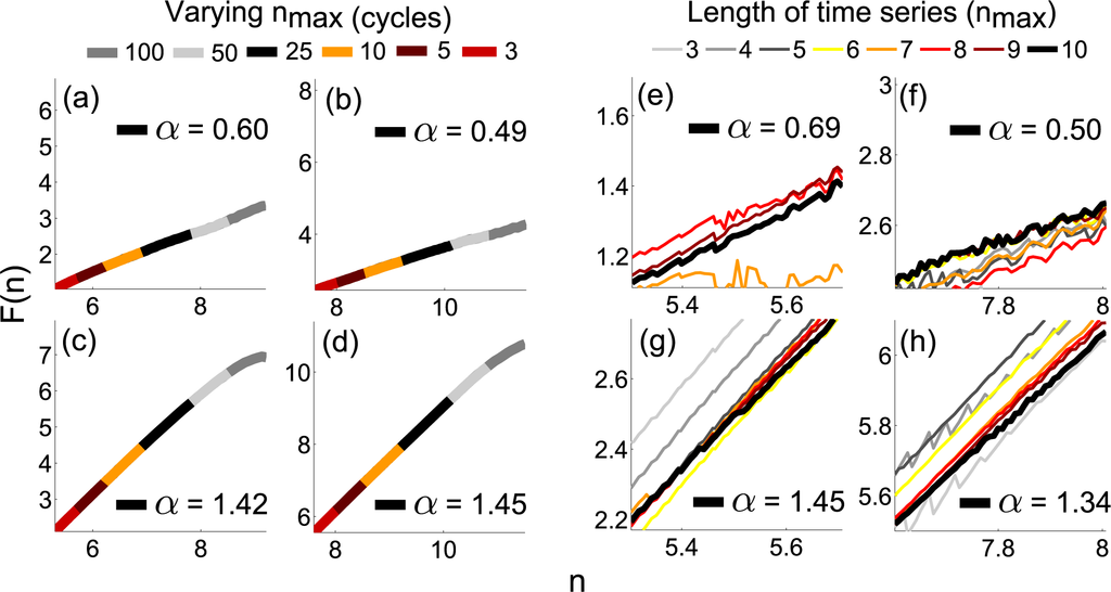 . The lower value, nmin, is set to be 2 cycles of the slowest oscillation, to ensure observation of the dynamics over a longer range than one cycle. The smallest nmax required to still obtain a reliable DFA exponent was observed to be nmax = 3 cycles of oscillation (see Figure 7), provided that the time series is sufficiently long. The second test seeks to identify the required length of the whole time series when using these values of nmin and nmax in DFA. The DFA exponent was calculated from varying lengths of the same noise signals, from 3 to 10 times nmax, to identify the point where the result is no longer reliable. It was found that the time series should be at least 8 times nmax in order to obtain a reliable result, therefore at least 24 cycles of the slowest oscillation are required to test for chronotaxicity. However, if possible, the time series should be at least 10 times nmax [38], to reduce noise by providing more data windows. Overlapping within DFA is also possible, and will go some way toward reducing noise, and improve reliability. The results shown in Figure 7 were obtained with an overlap of 0.8.