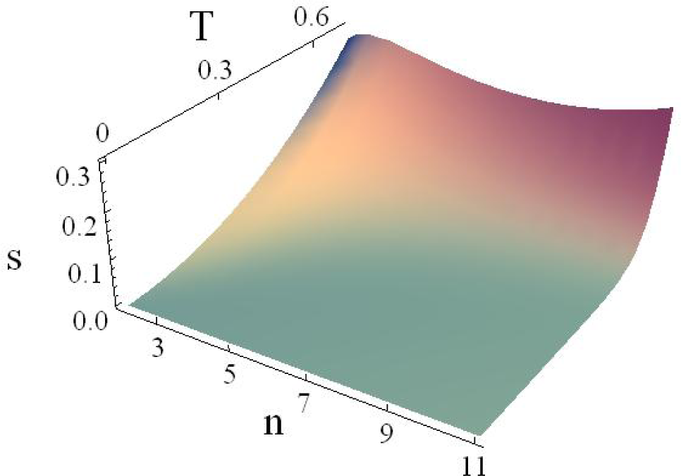 Now, we shall analyze the behavior of energy, entropy and Helmholtz free energy densities (see Figures 1 and 3). All of the potentials have a region of concavity or convexity along the n-axis. Here, n is just a parameter, and it is not a thermodynamic variable, since there is not a conjugate variable whose product has energy units and appears in the Gibbs equation. The units used are the so-called Planck or natural units [41]. In this scale, the Planck temperature is TP = 1.42 × 1032K, and the energy of Planck is EP = 1.9561 × 109J. In each plot, the most relevant region is the one at high temperatures and low dimensions, as can be seen in Figures 1–3.