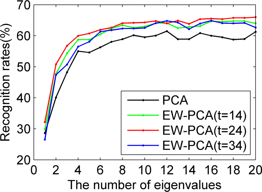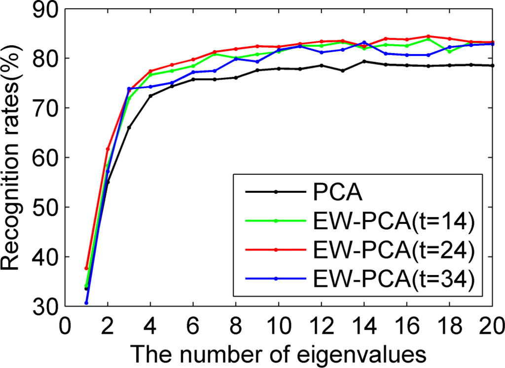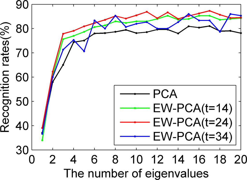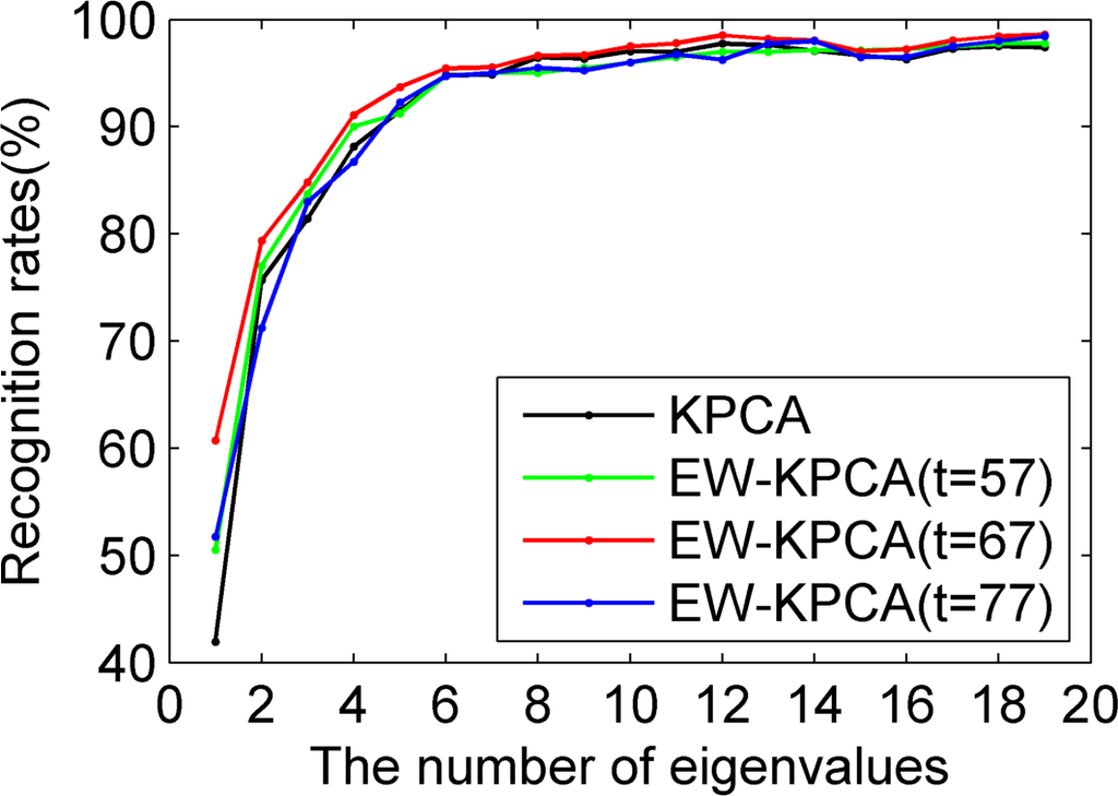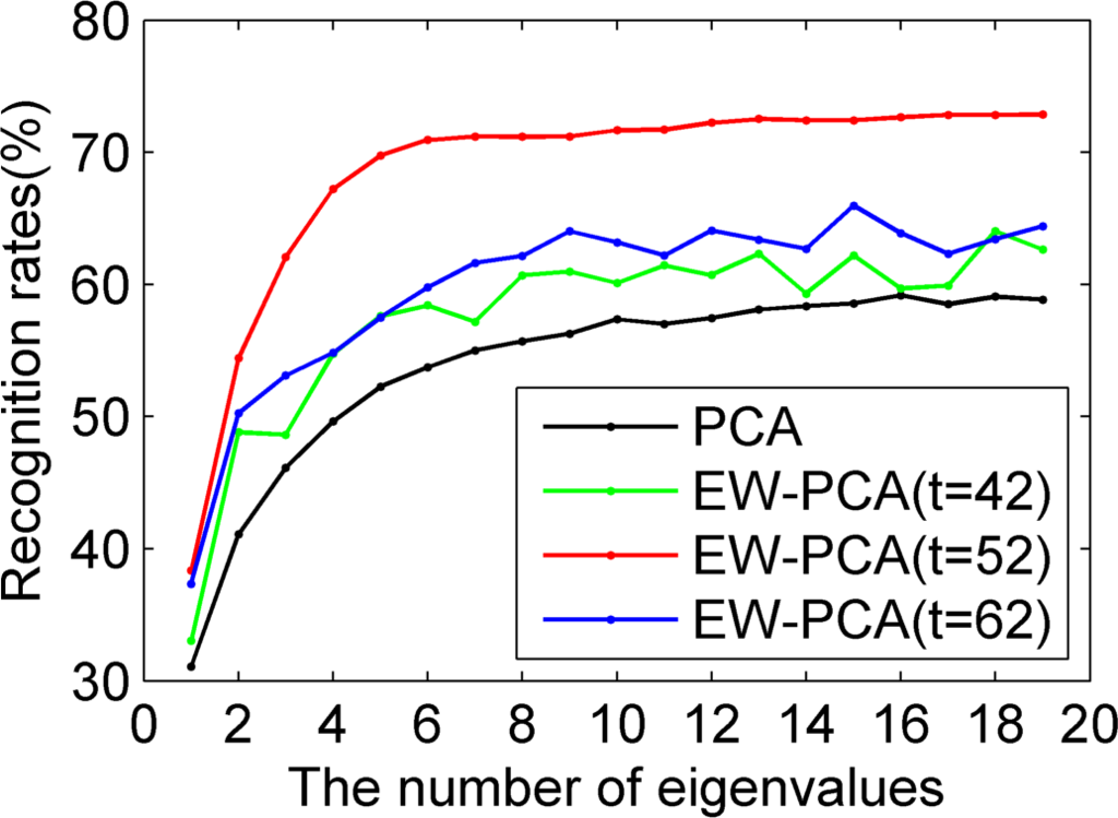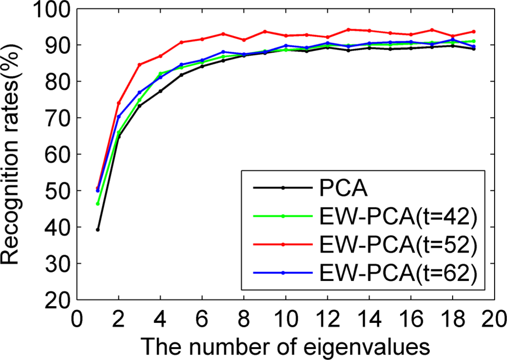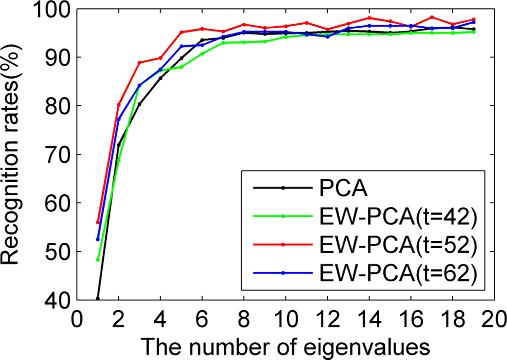 , the approximately optimal threshold value. It can be seen from Figure 5 that the highest recognition rates were basically close in the red fold line and the dark fold line, the former was a little higher than the latter, but if the selected eigenvalues were relatively small, for example, just keeping two eigenvalues, the recognition rate of EW-PCA with