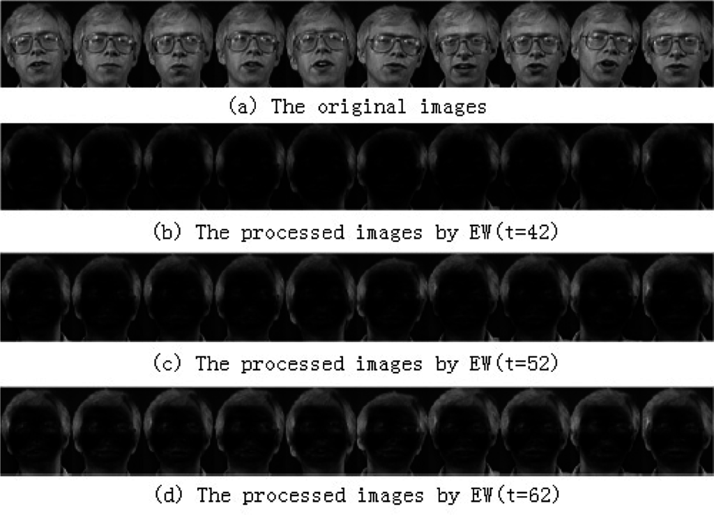 were also calculated in Figure 4. Figure 4a is the original images. Figure 4b–d show the different local feature retention effects. Compared to Figure 4c, Figure 4b appears to be less well characterized, while Figure 4d seems to extract too many local features which were not conducive to identification. Although there were differences in the EM local retention effects when the thresholds varied in a reasonable range, on the whole these differences of the EW feature retention effects was reasonably small which indicted the robustness of the proposed method to a certain degree.