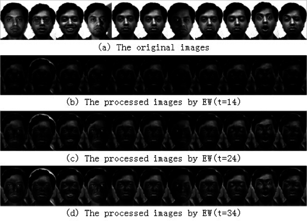 The proposed method is more suitable for processing frontal facial images, where the recognition rates of our EW methods is significantly better than the methods not using EW. If the angle of view or expression changes, the recognition effects using the EW method is not so obvious, so we need to pay more attention to this method in application. In addition, the EW method can also be combined with other face recognition methods such as the two-dimensional PCA method, to further improve the corresponding algorithm. Through the effective recognition rates for different methods of EW-PCA and EW-KPCA, we see that the EW-based method is the essential part of the whole algorithm which improves the efficiency of the algorithm.