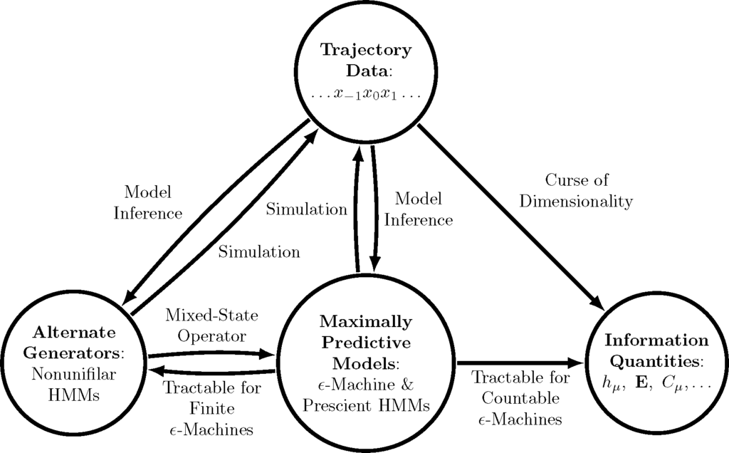 While it is certainly possible to numerically estimate information measures directly from trajectory data, statistical methods generally encounter a curse of dimensionality when a renewal process has long-range temporal correlations, since the number of typical trajectories grows exponentially (at entropy rate hμ). Alternatively, we gain substantial advantages by first building a maximally-predictive model of a process (e.g., using Bayesian inference [24]) and then using that model to calculate information measures (e.g., using recently-available closed-form expressions when the model is finite [25]). Mathematicians have known for over a half century [26] that alternative models that are not maximally predictive are inadequate for such calculations. Thus, maximally-predictive models are critical. Figure 1 depicts the overall procedure just outlined, highlighting its important role. Here, extending the benefits of this procedure, we determine formulae for the information measures mentioned above and the appropriate structures for a class of processes that require countably infinite models: the ubiquitous renewal processes.