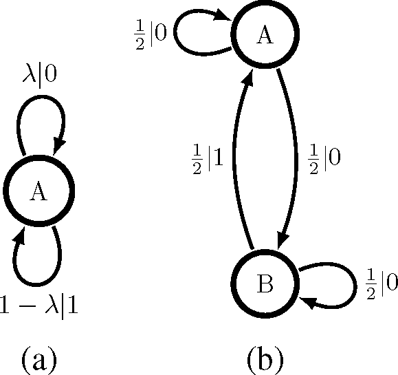 It will be helpful pedagogically to anchor our theory in the contrast between two different, but still simple, renewal processes. One is the familiar “memoryless” Poisson process with rate λ. Its HMM generator, a biased coin, is shown at the left of Figure 2. It has an interevent count distribution F(n) = (1 − λ)λn; a distribution with unbounded support. However, we notice in Figure 2 that it is a unifilar model with a minimal number of states. Therefore, in fact, this one-state machine is the ϵ-machine of a Poisson process. The rate at which it generates information is given by the entropy rate: hμ = H(λ) bits per output symbol. (Here, H(p) is the binary entropy function.) It also has a vanishing statistical complexity and, so, stores no historical information.