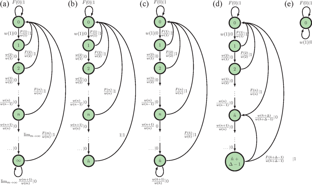 Figure 3a–d displays the causal state architectures, depicted as state-transition diagrams, for the ϵ-machines in the various cases delineated. Figure 3a is the ϵ-machine of a generic renewal process whose interevent interval can be arbitrarily large and whose interevent distribution never has exponential tails. Figure 3b is the ϵ-machine of a renewal process whose interevent distribution never has exponential tails, but cannot have arbitrarily large interevent counts. The ϵ-machine in Figure 3c looks quite similar to the ϵ-machine in Figure 3b, but it has an additional transition that connects the last state ñ to itself. This added transition changes our structural interpretation of the process. Interevent counts can be arbitrarily large for this ϵ-machine, but past an interevent count of ñ, the interevent distribution is exponential. Finally, the ϵ-machine in Figure 3d represents an eventually Δ-Poisson process with Δ > 1 whose structure is conceptually most similar to that of the ϵ-machine in Figure 3c. (See Definition 2 for the precise version of that statement.) If our renewal process disallows seeing interevent counts of a particular length L, then this will be apparent from the ϵ-machine, since there will be no transition between the causal state corresponding to an interevent count of L and causal state 0.