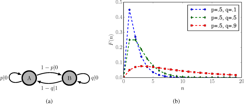 To illustrate this point, we focus our attention on a parametrized version of the SNS shown in Figure 4a. As for the original SNS in Figure 2, transitions from state B are unifilar, but transitions from state A are not. As noted before, the time series generated by the parametrized SNS is a discrete-time renewal process with interevent count distribution: